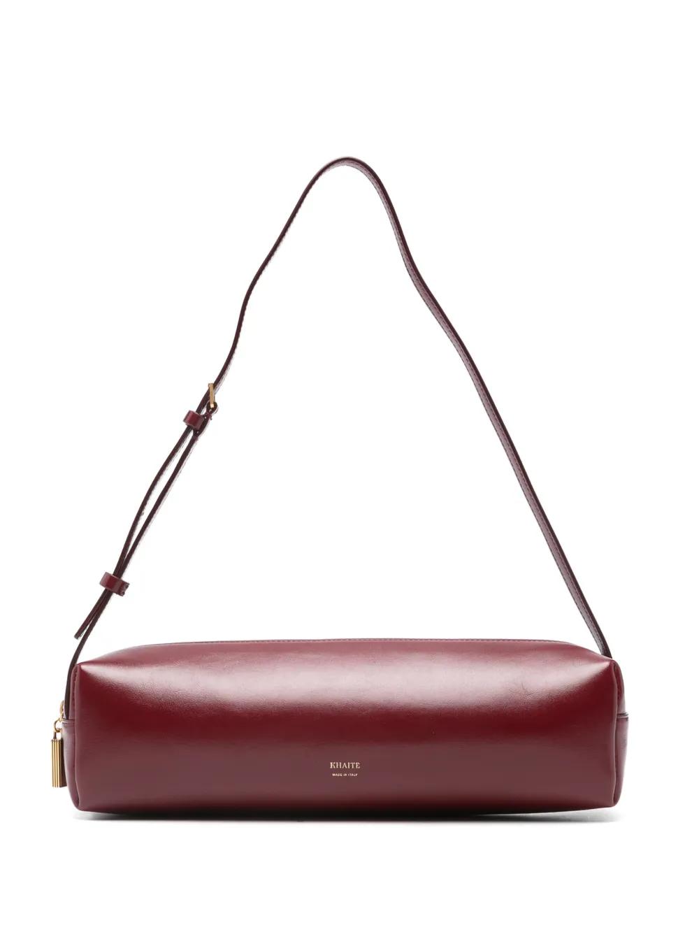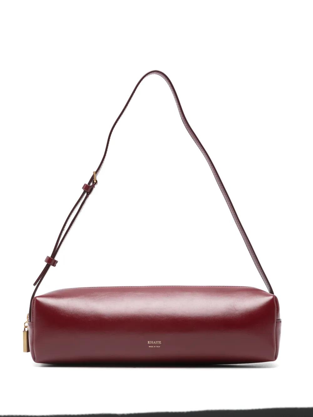 burgundy cylindrical shape top zip fastening adjustable shoulder strap gold-tone hardware