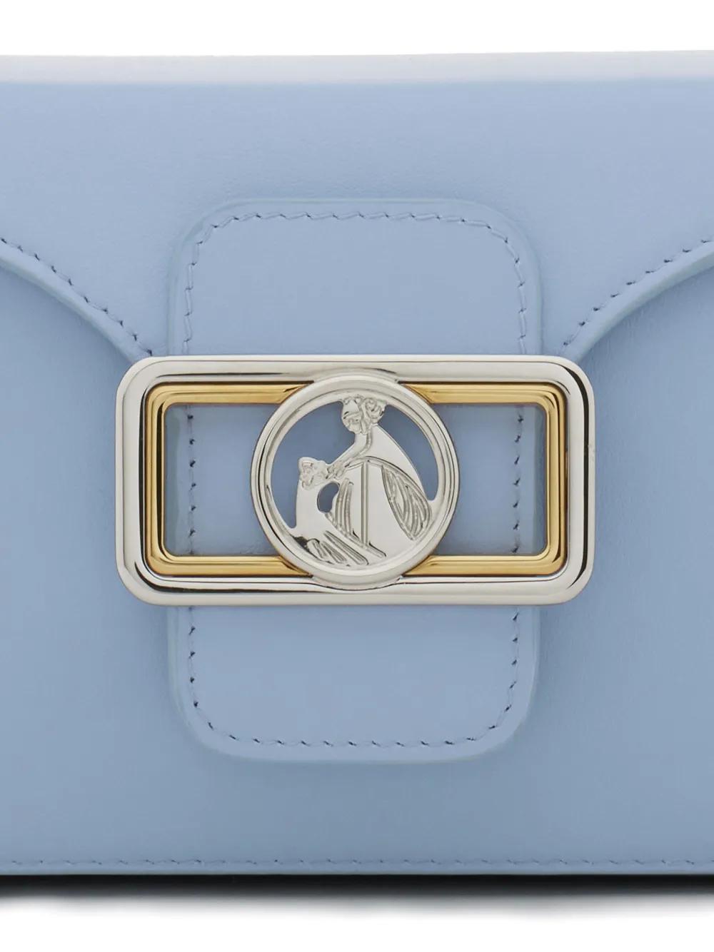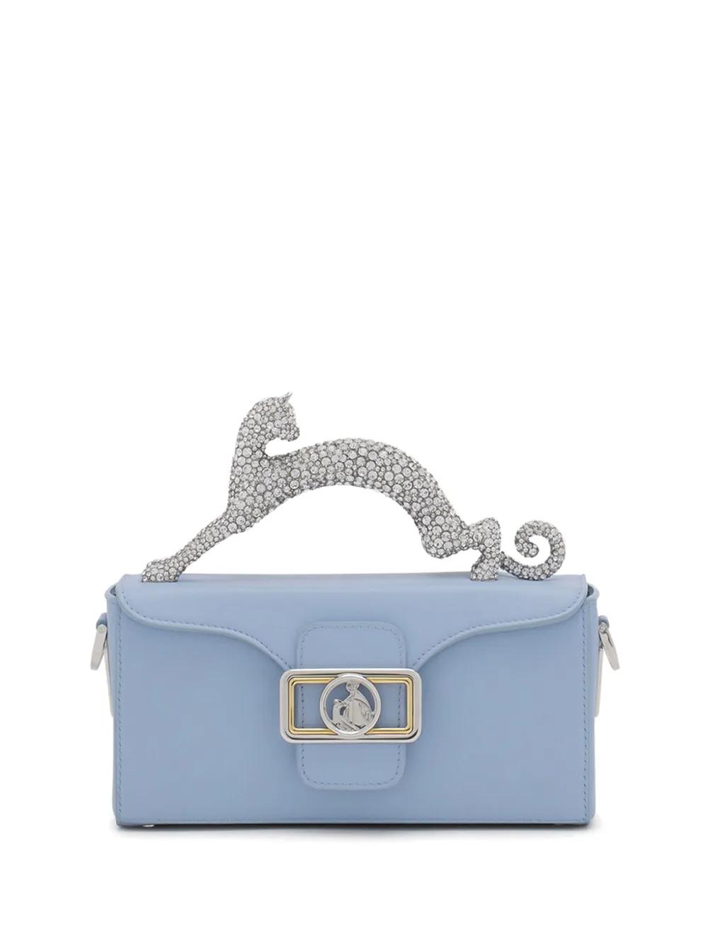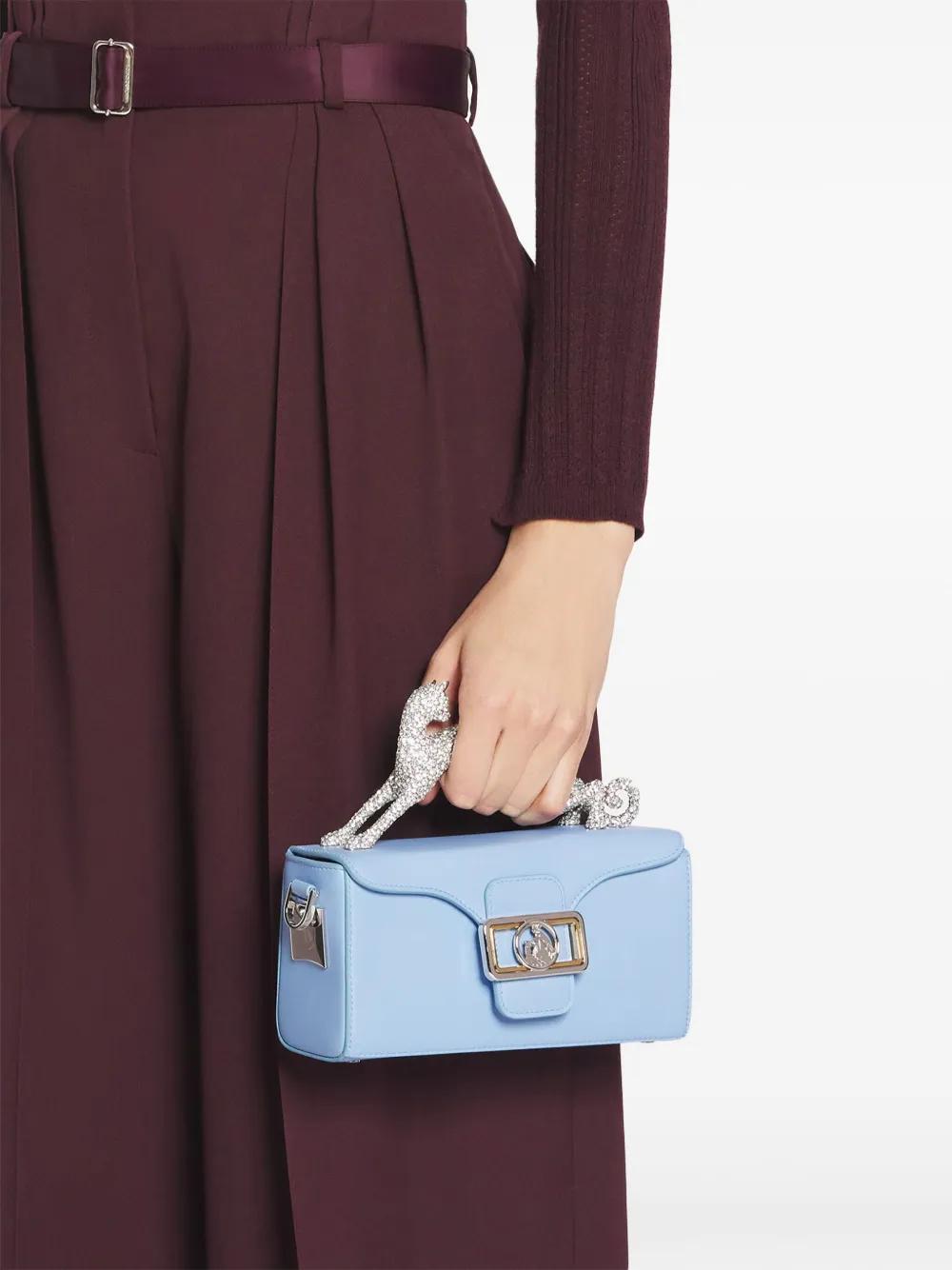 light blue leather crystal embellishment sculpted handle adjustable detachable shoulder strap foldover top with magnetic fastening main compartment internal card slot internal logo patch suede lining silver-tone hardware