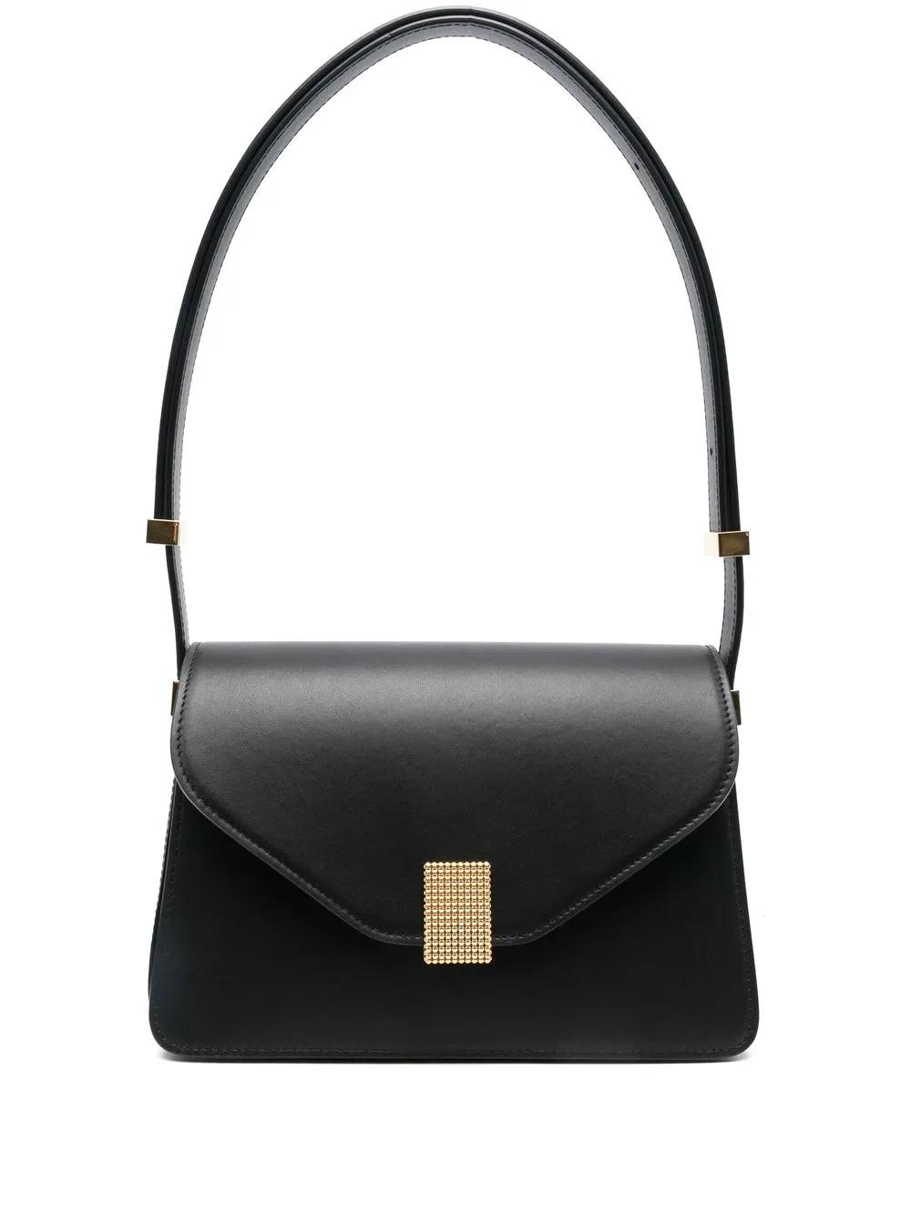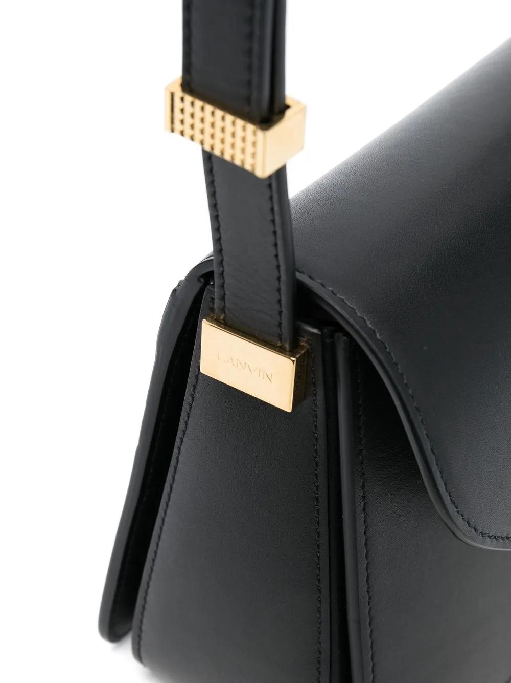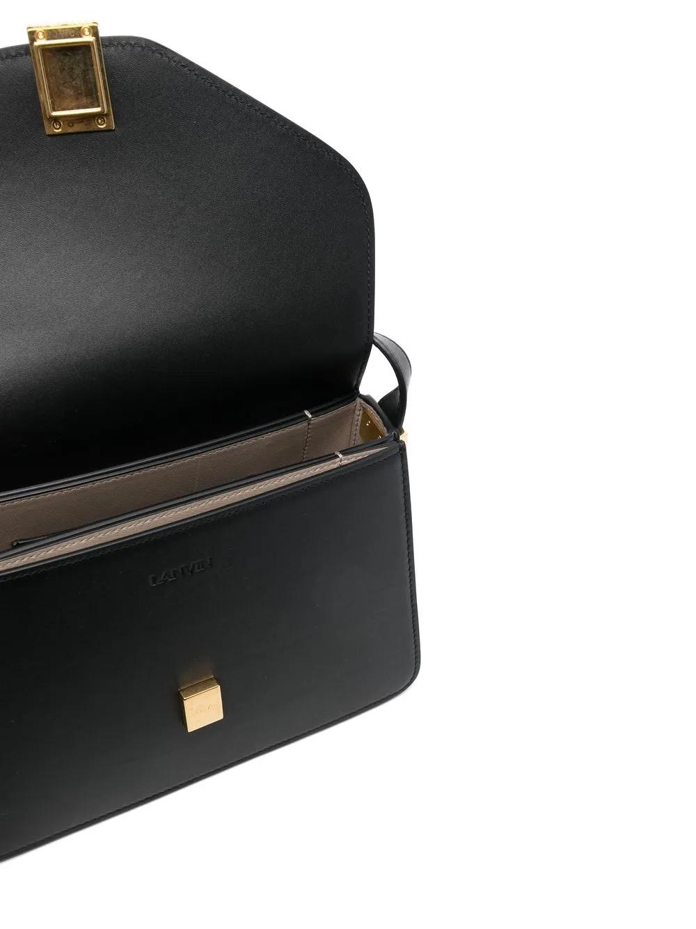 black calf leather gold-tone hardware internal logo stamp main compartment internal slip pocket foldover top clip-lock fastening adjustable top handle