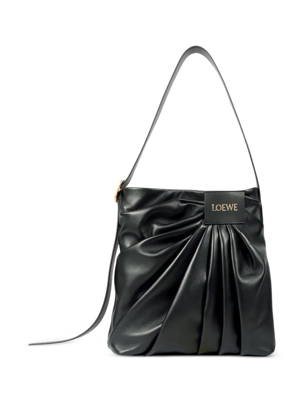 black draped detail top handle embossed logo gold-tone hardware adjustable strap