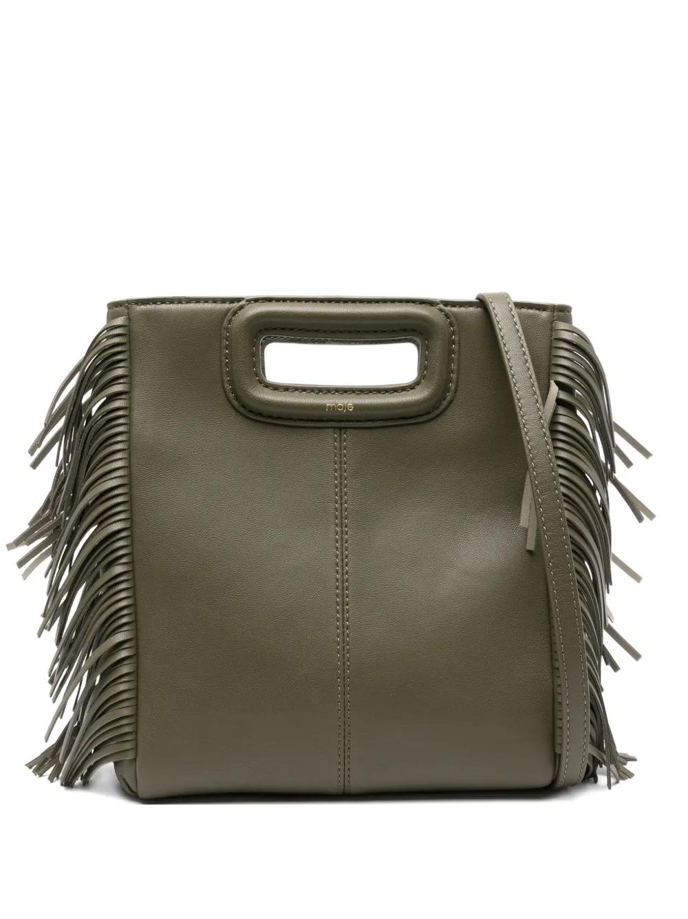 khaki leather fringing detail sheathed handle embossed gold logo magnetic tab closure