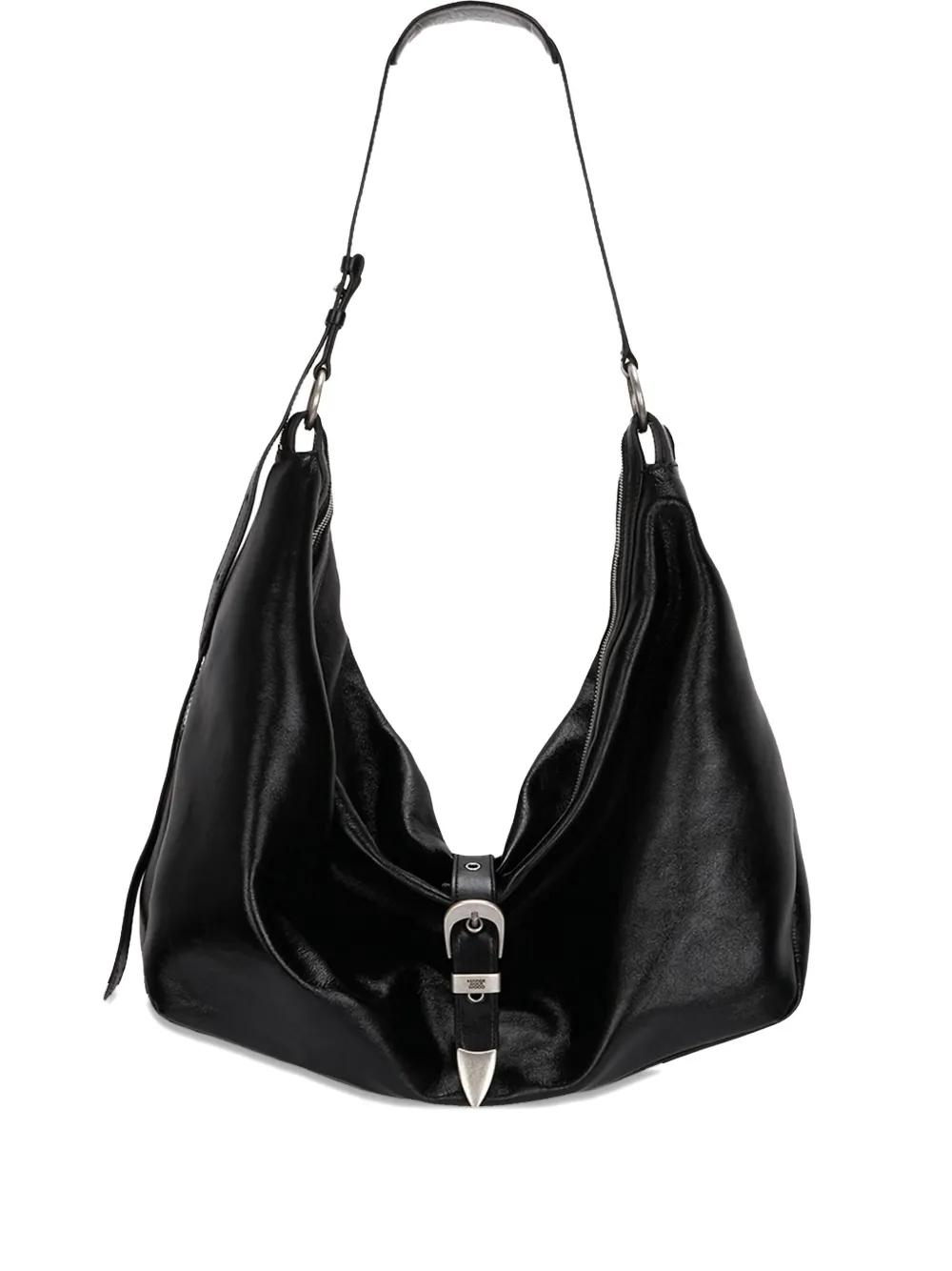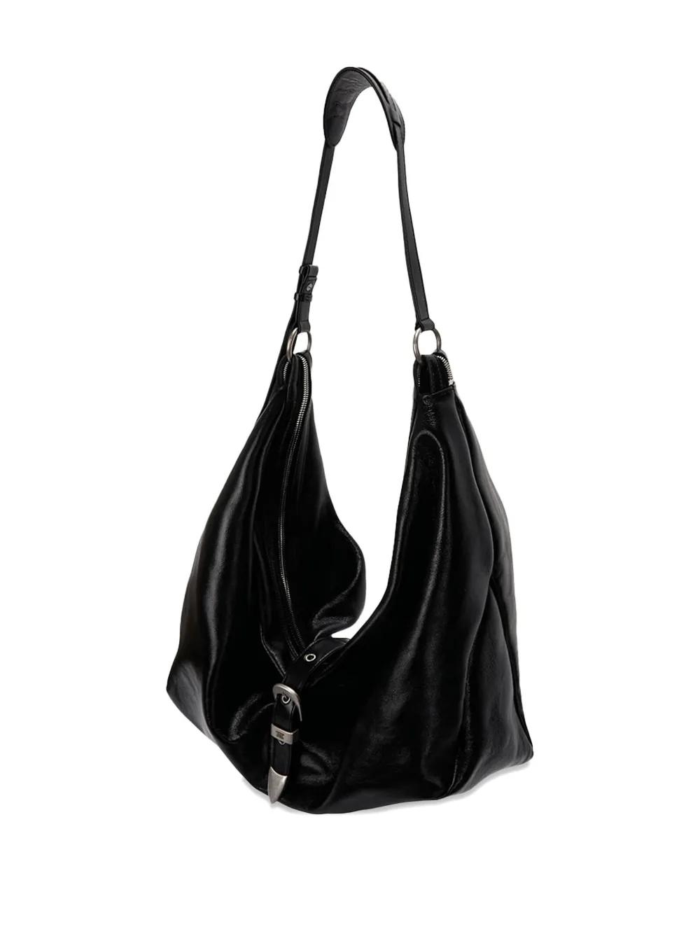 black leather construction buckle fastening single shoulder strap curved silhouette zip closure