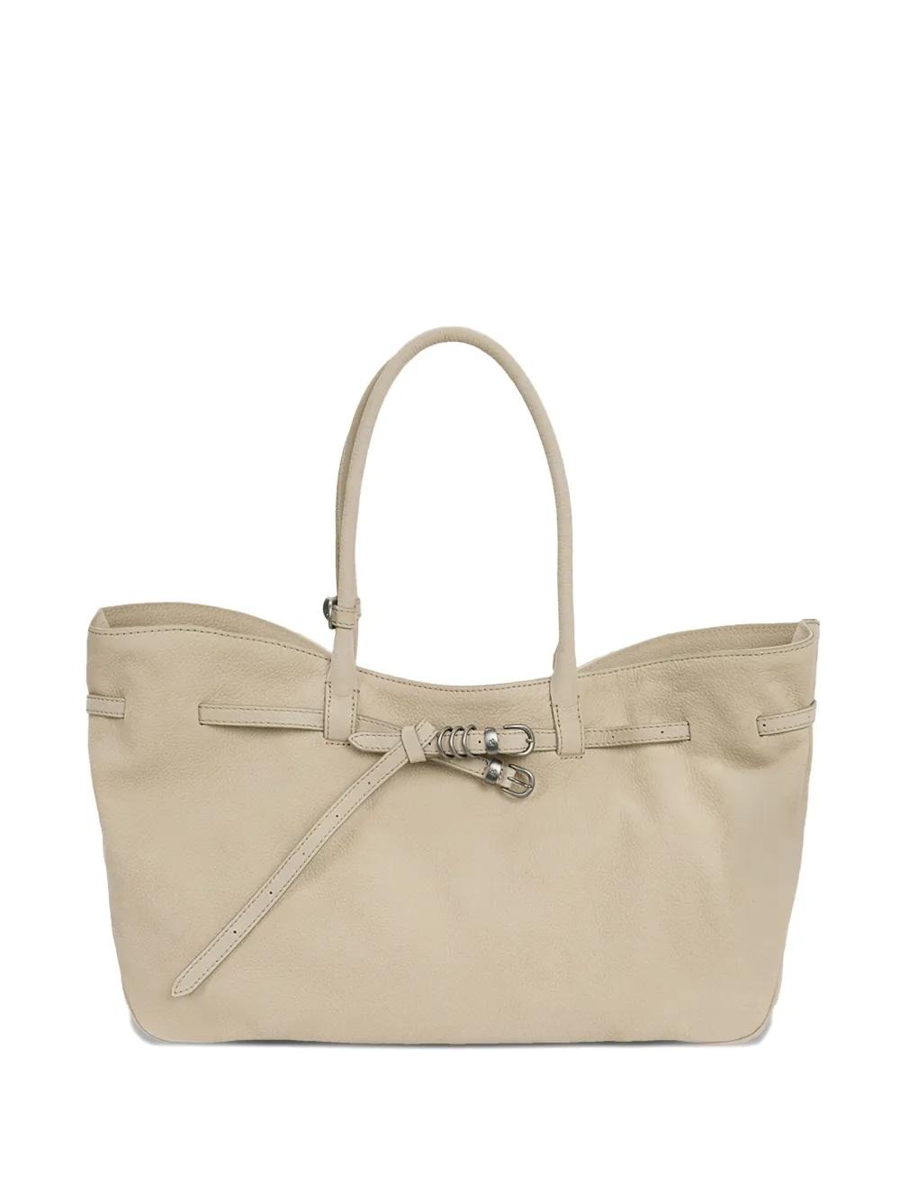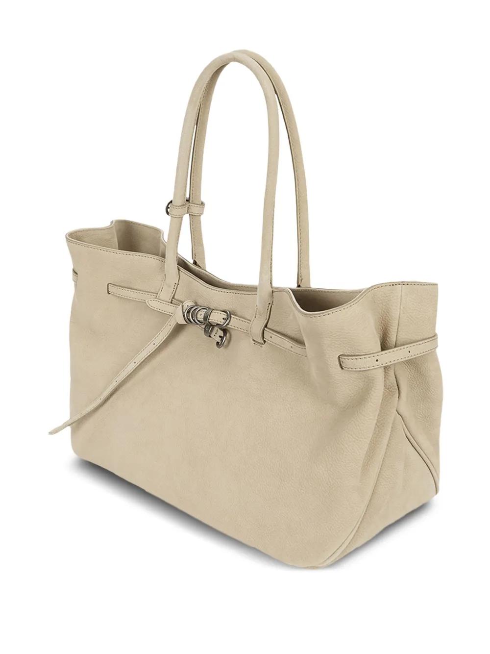 beige nubuck leather buckle fastening top handles drawstring closure