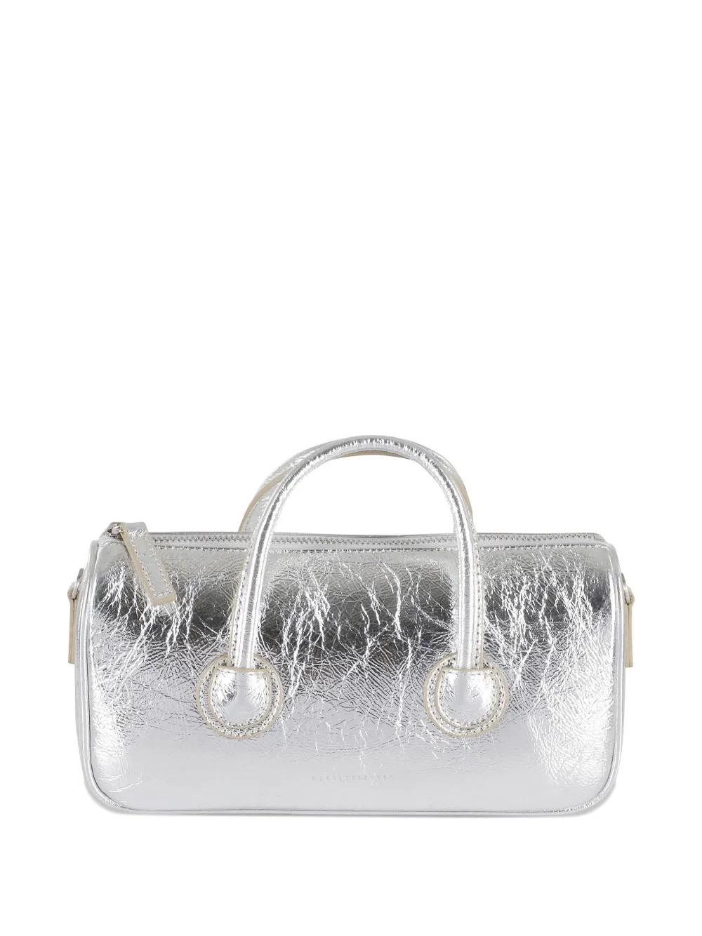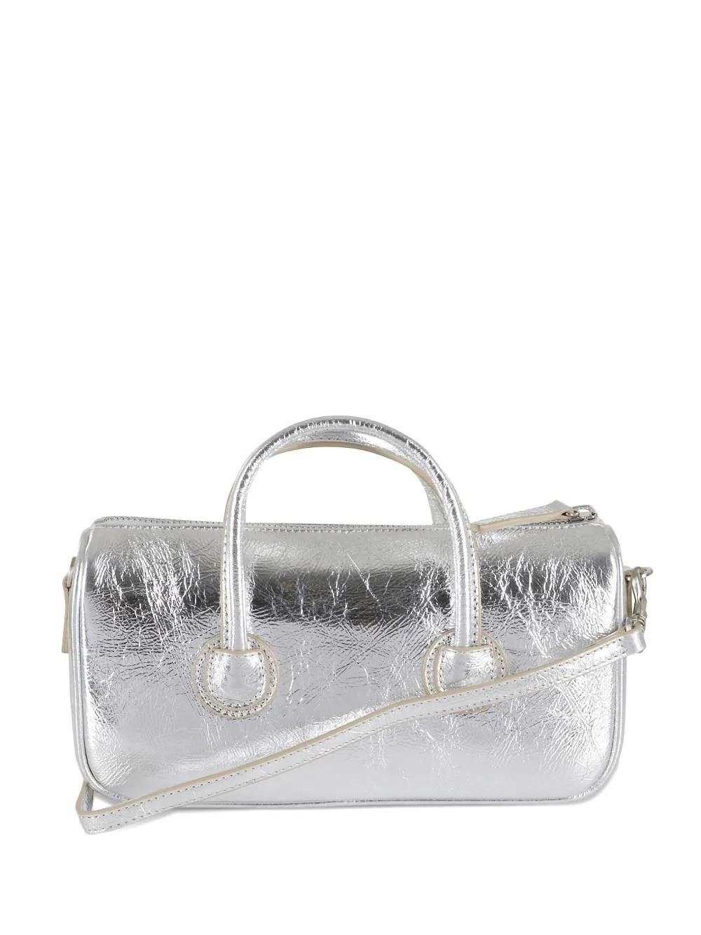 silver crinkled leather top handles zip fastening detachable shoulder strap