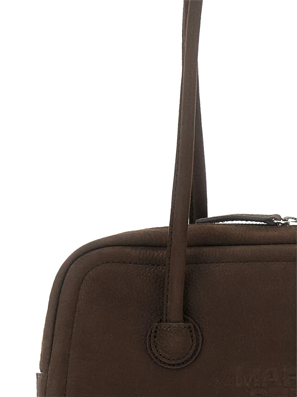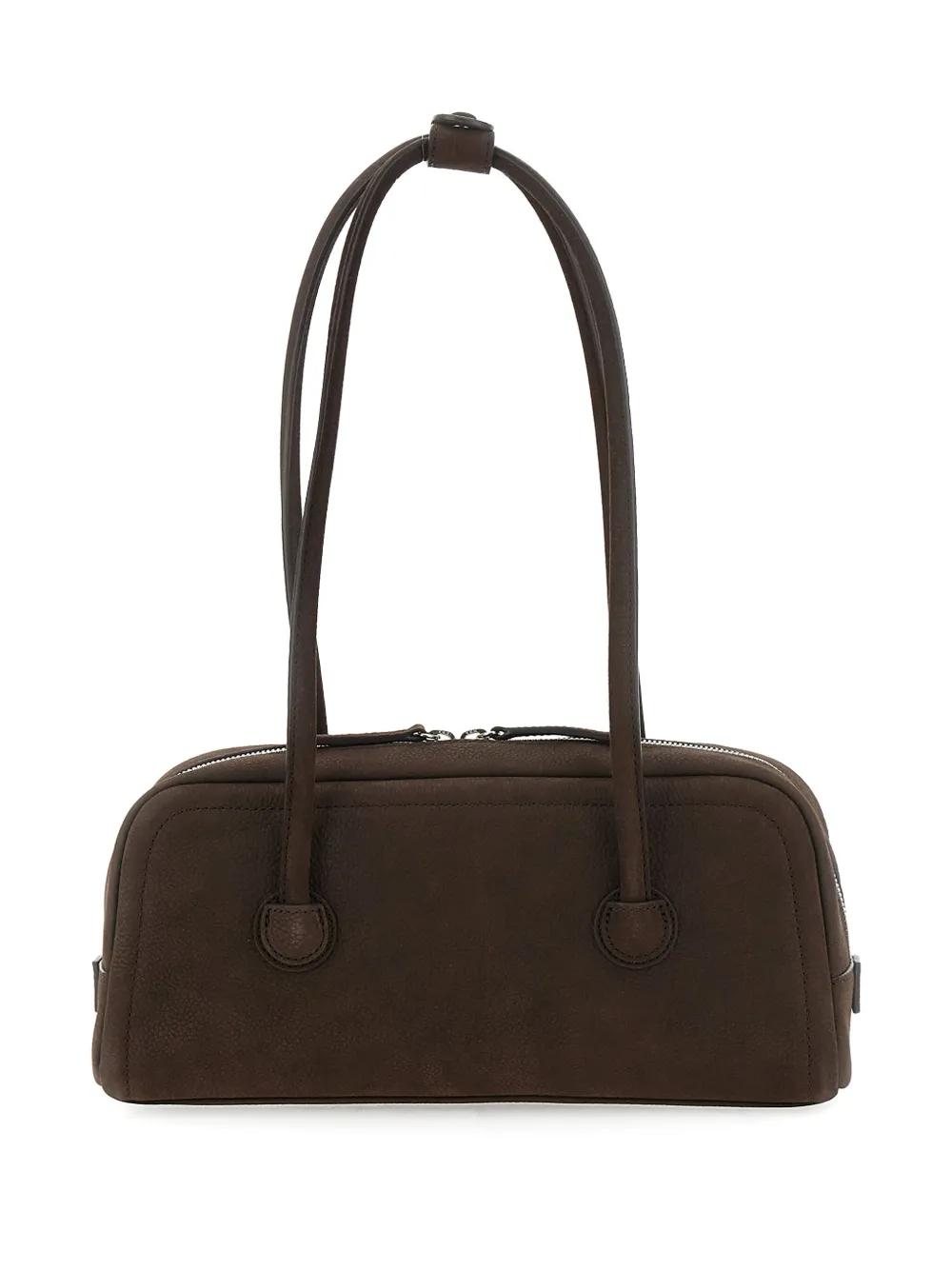 brown leather construction top-zip fastening double handles embossed logo rectangular shape