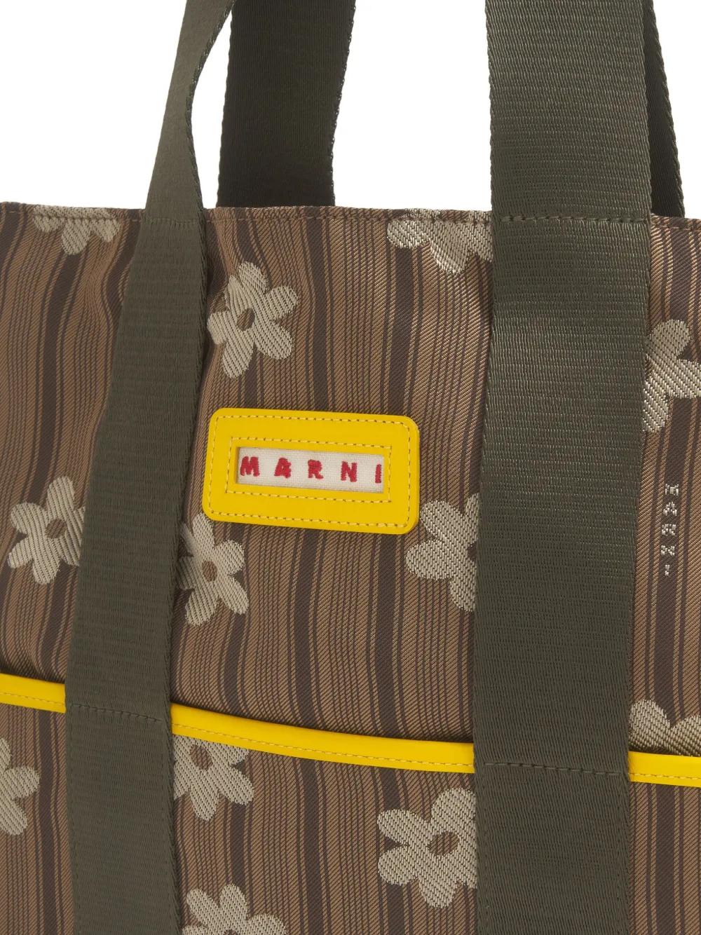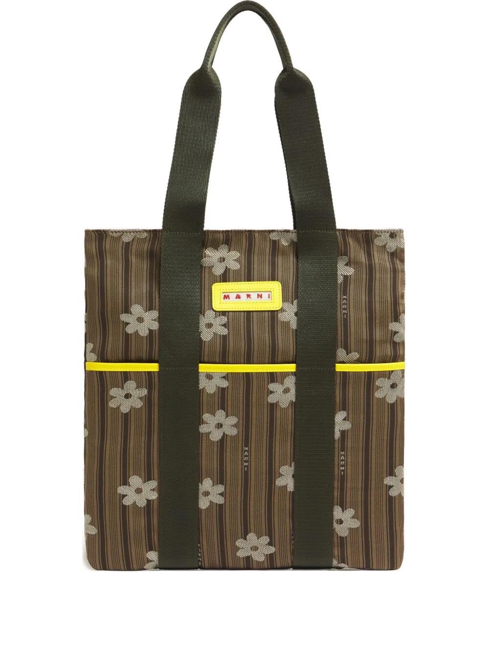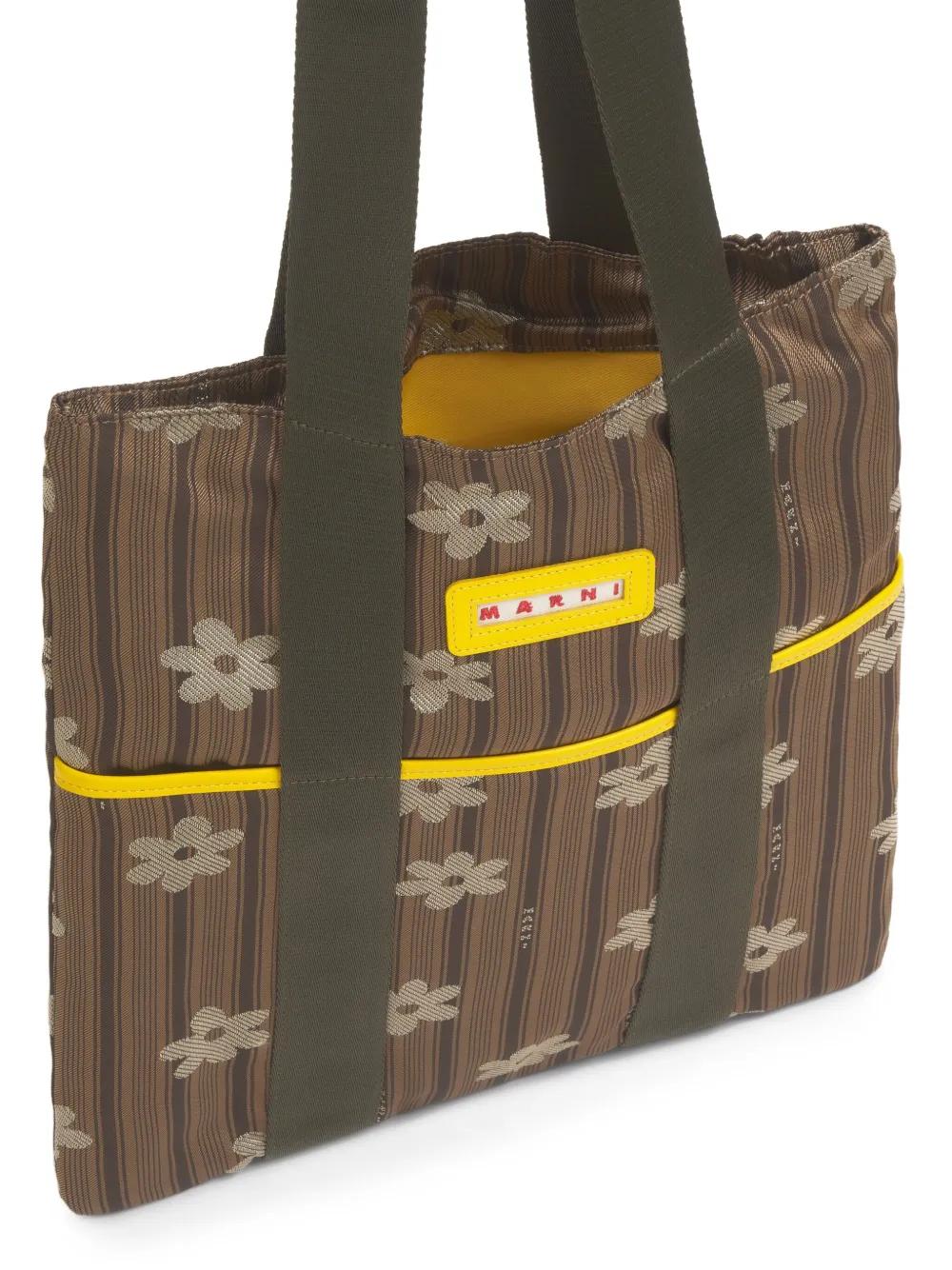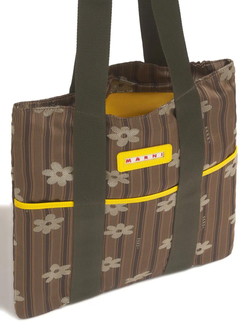 brown stripe and floral pattern tape handles leather accents embroidered logo