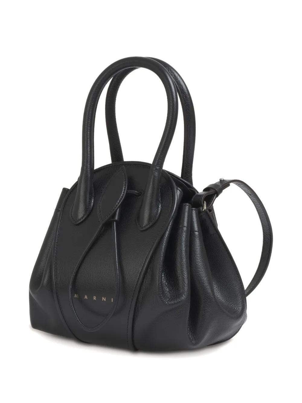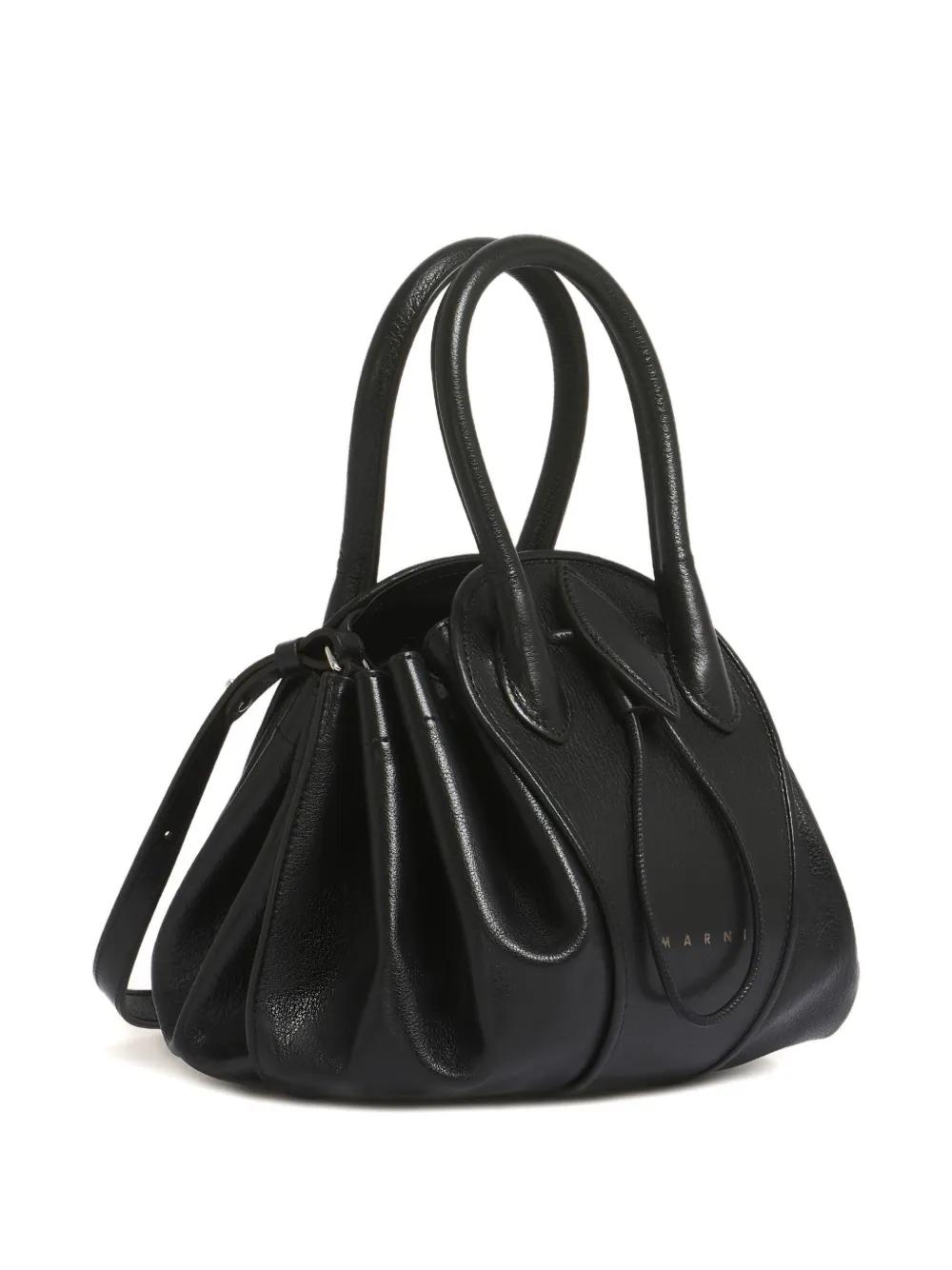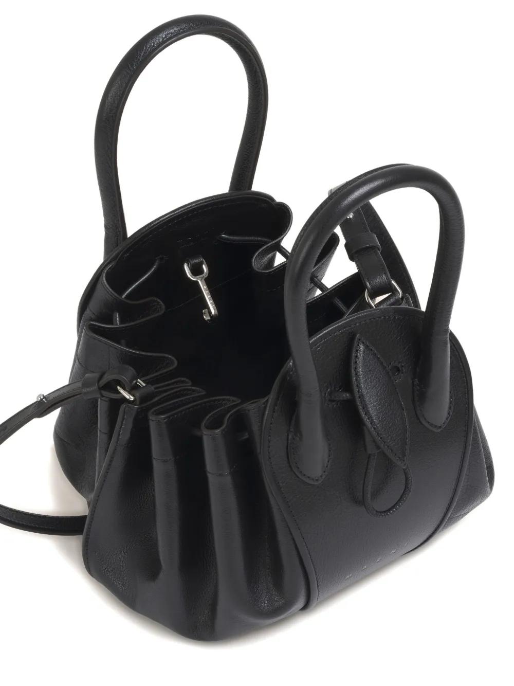 black buffalo leather tubular top handles detachable shoulder strap hot-stamped logo drawstring fastening