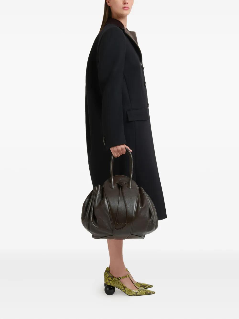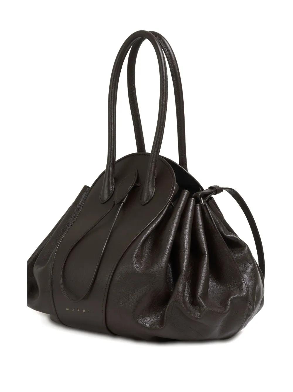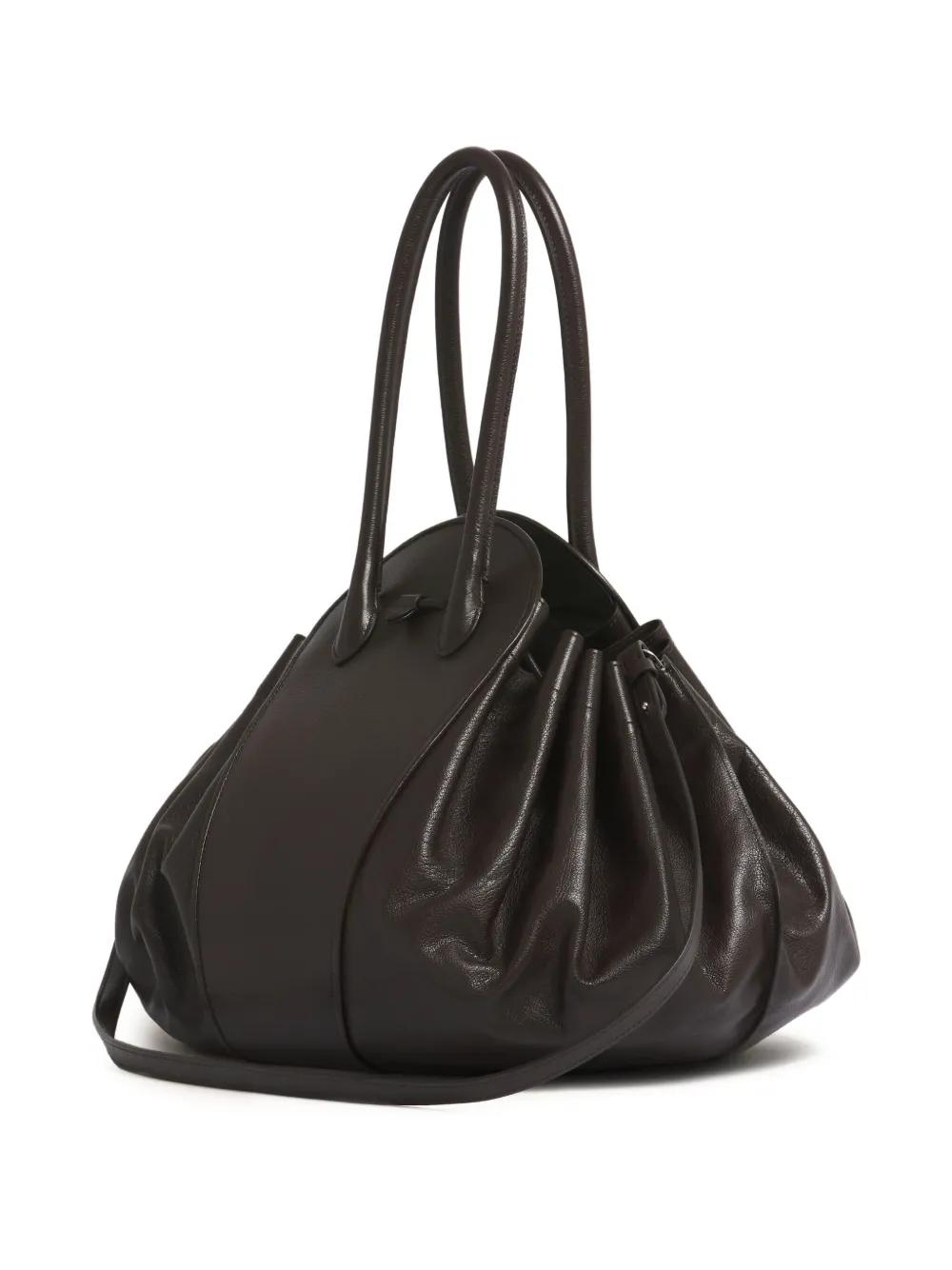 dark brown buffalo leather tubular top handles detachable shoulder strap hot-stamped logo drawstring fastening