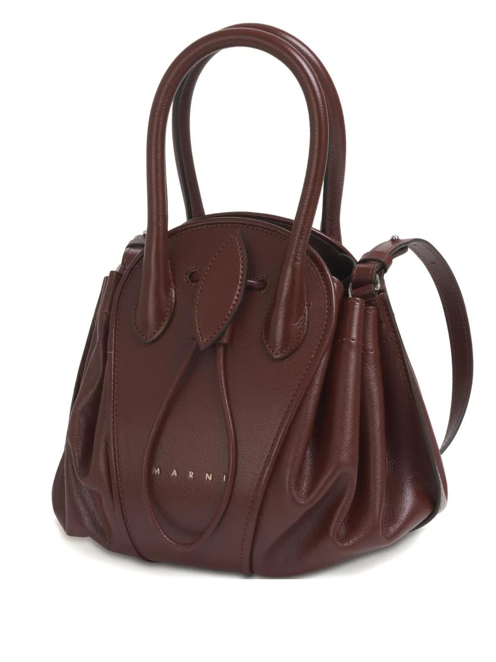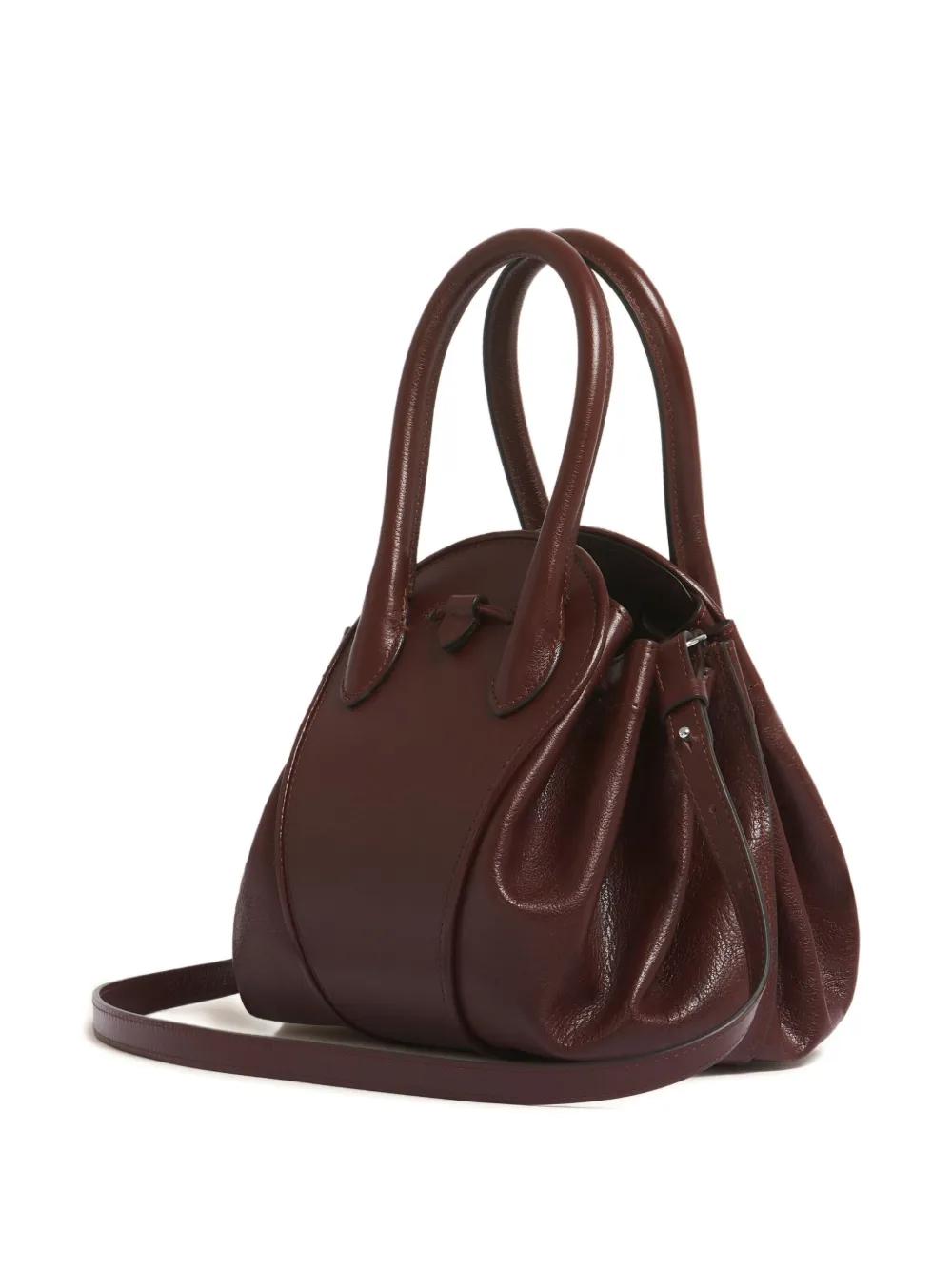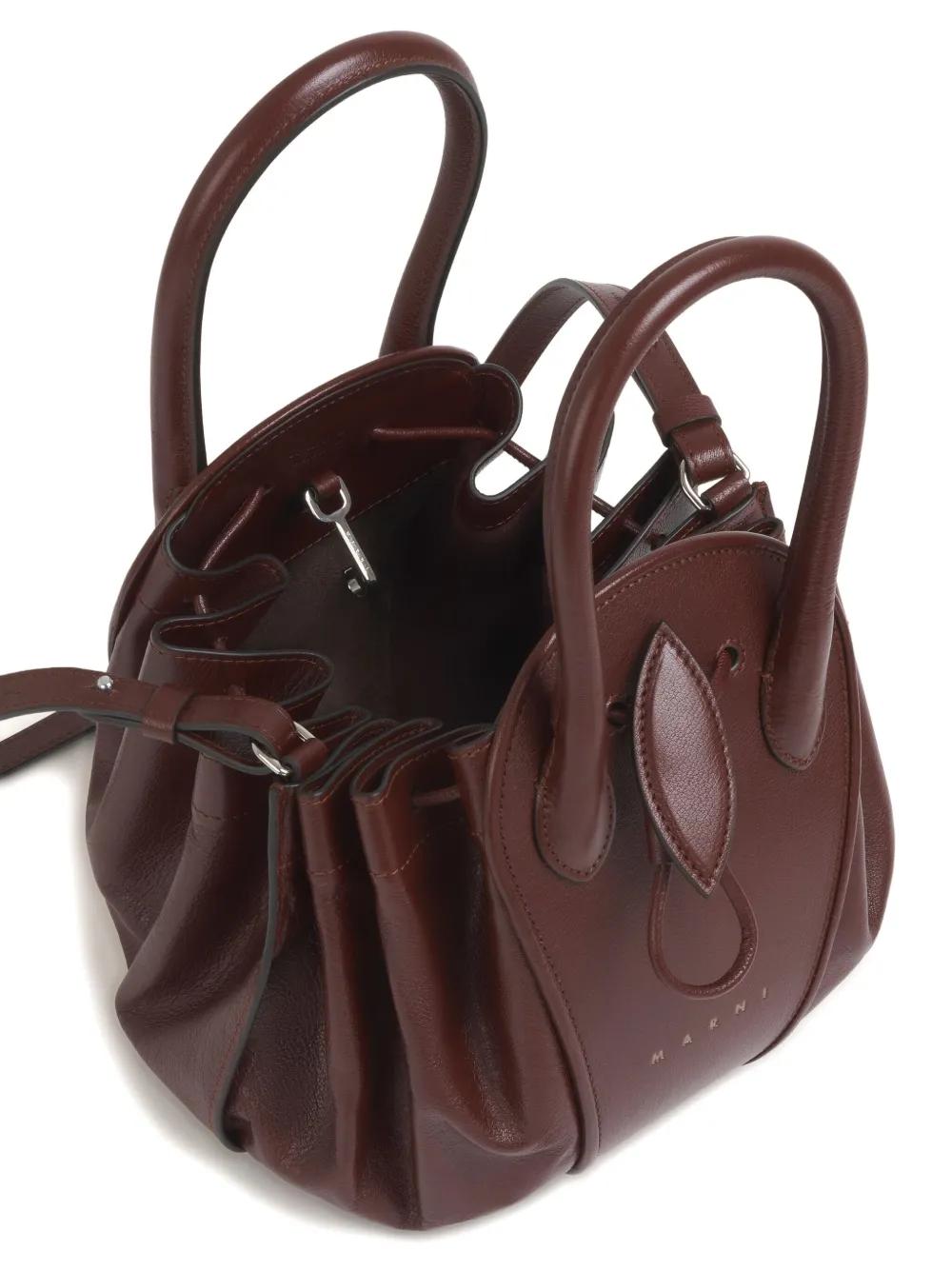 dark brown buffalo leather tubular top handles detachable shoulder strap hot-stamped logo drawstring fastening