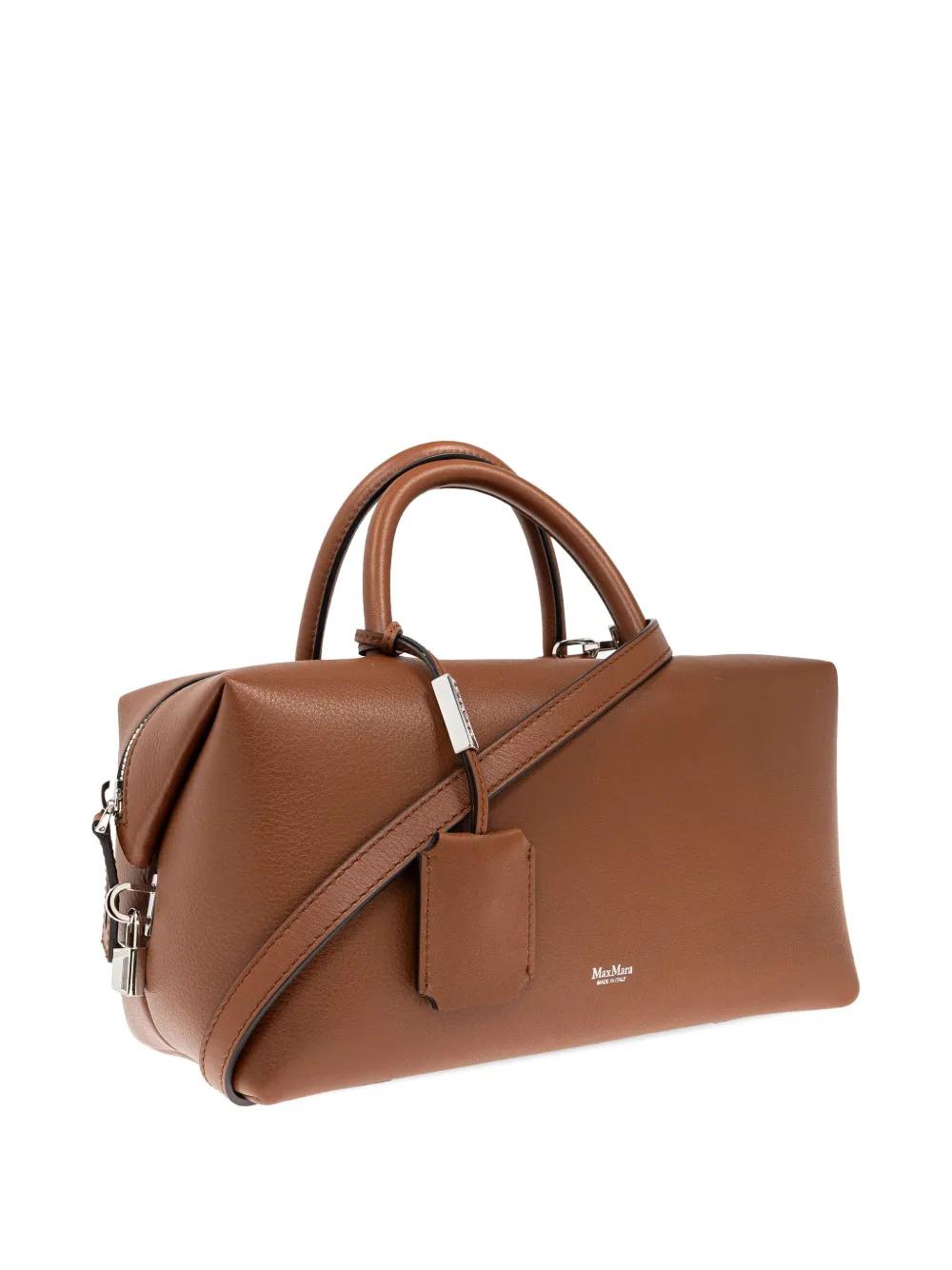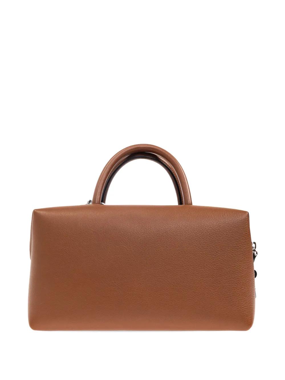 brown detachable shoulder strap two top handles logo tag main compartment