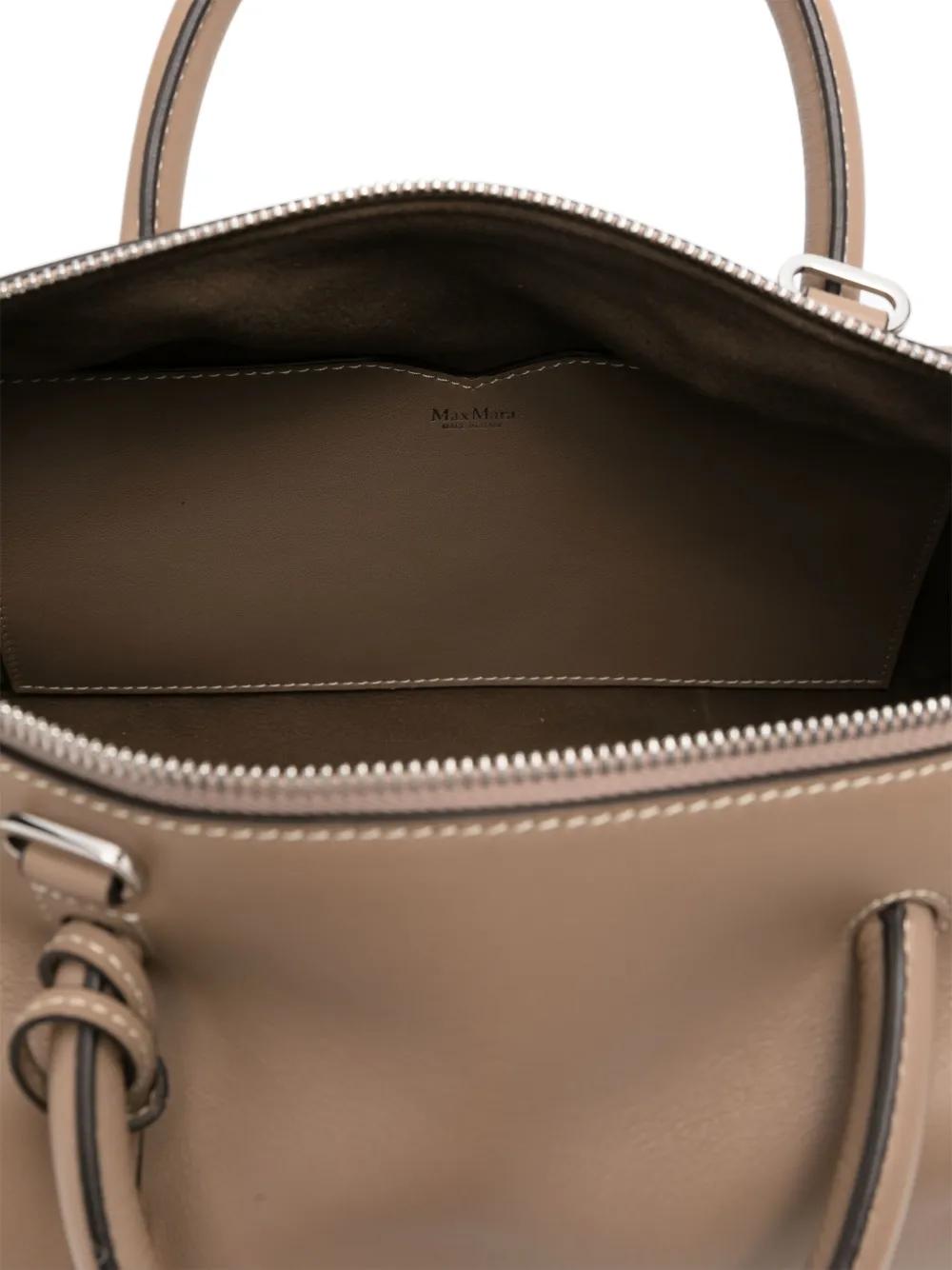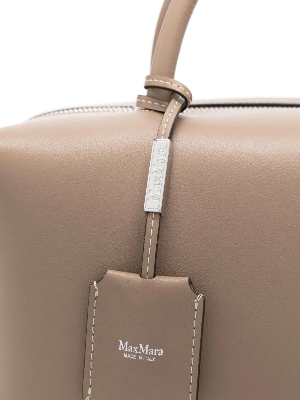 beige top zip fastening two rolled top handles adjustable detachable shoulder strap logo stamp to the front