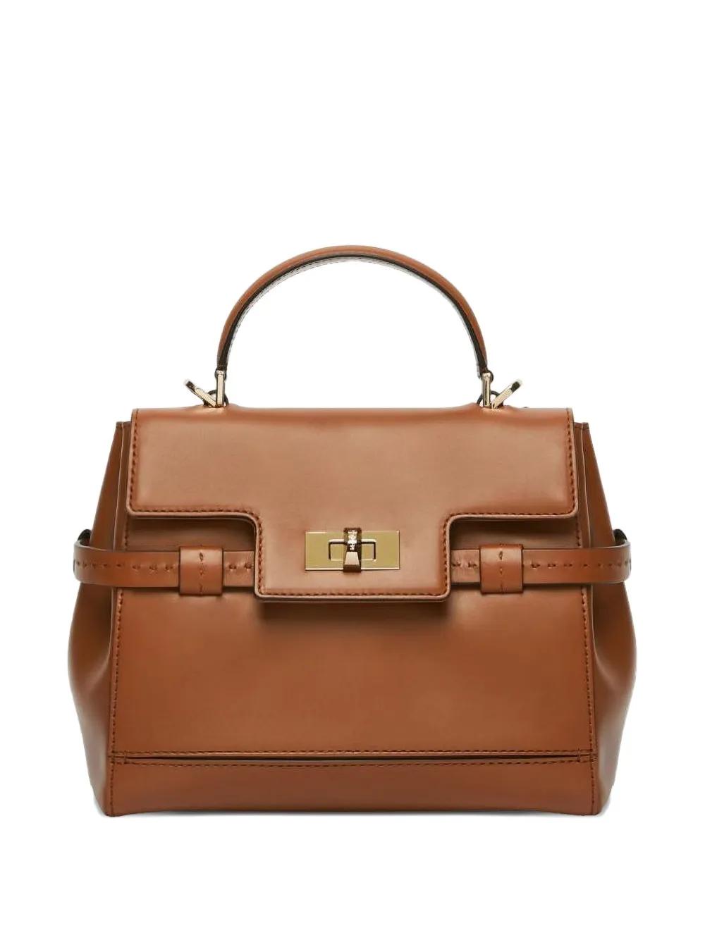 brown calf leather top handle gold-tone hardware buckle fastening detachable shoulder strap