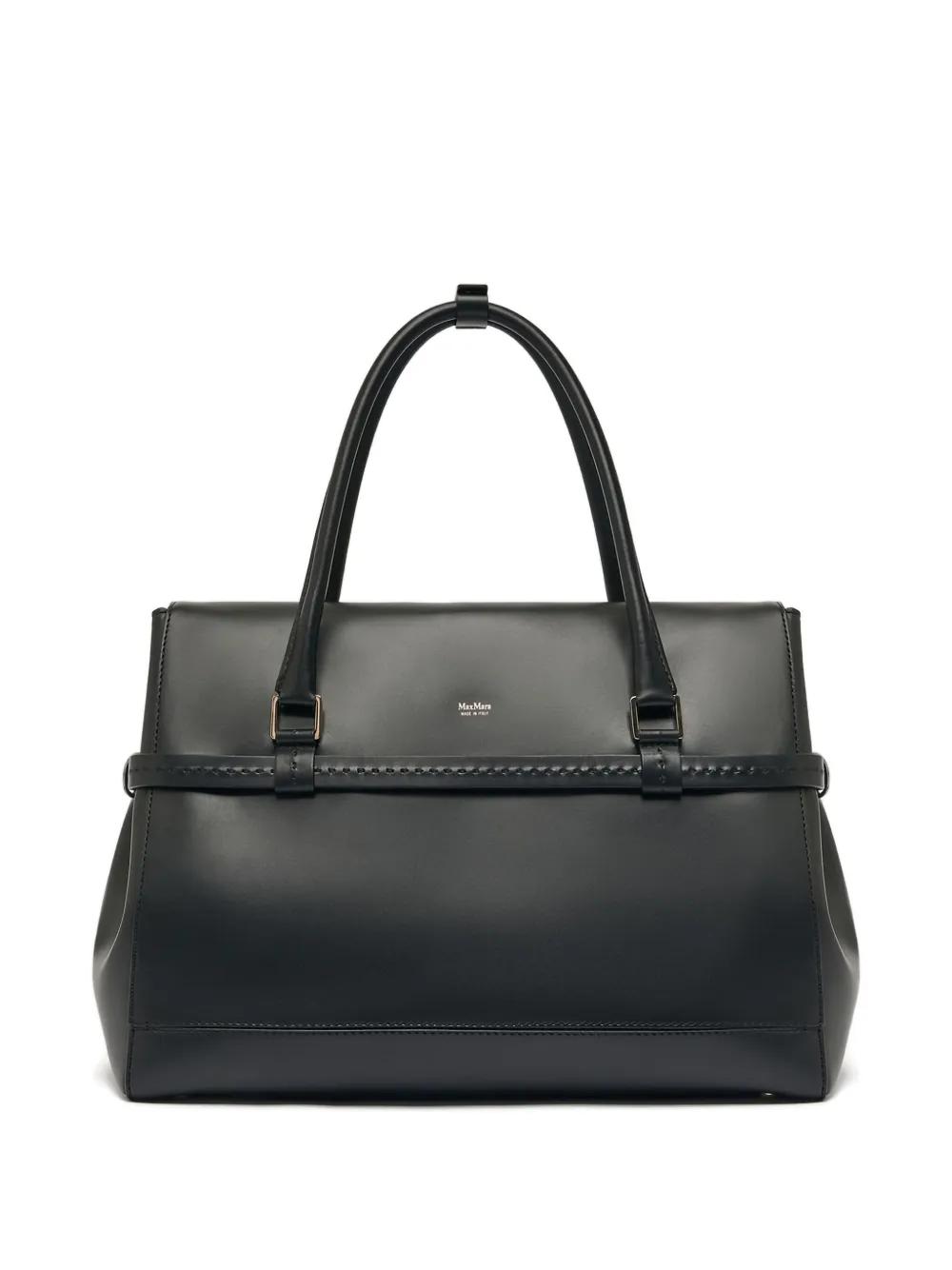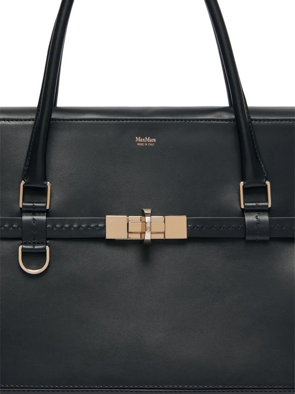 black leather two top handles gold-tone hardware buckle fastening main compartment