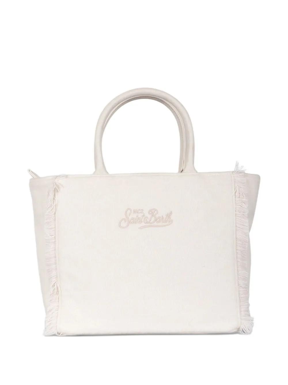 white embroidered logo fringed trim top handles detachable shoulder strap