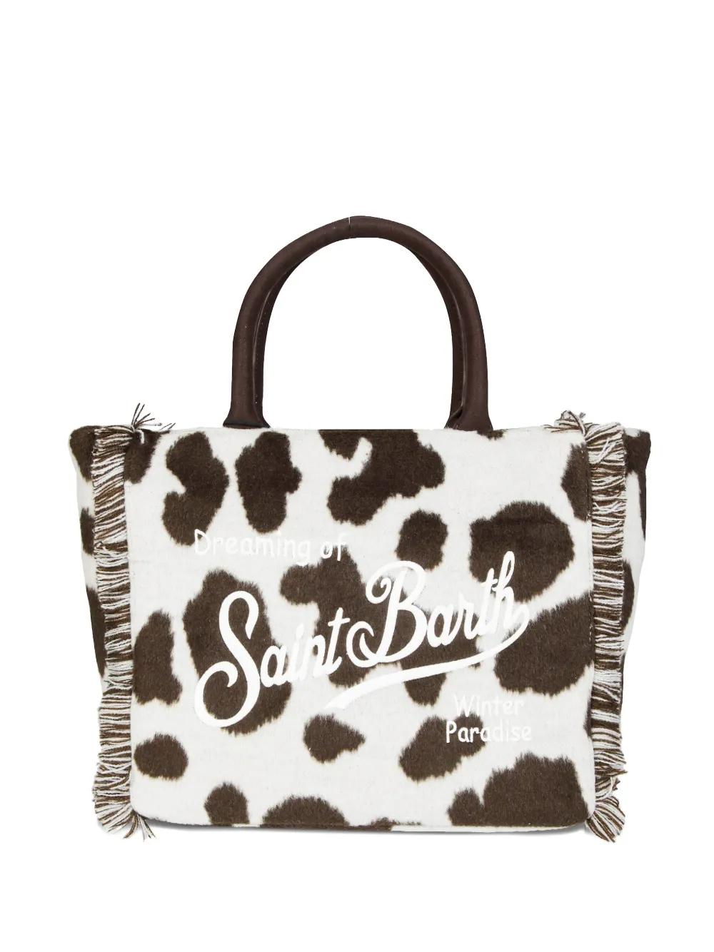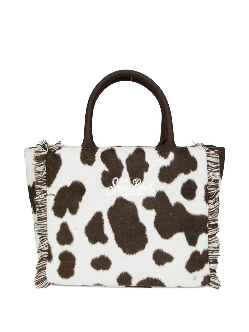 white cow print top handle fringed trim