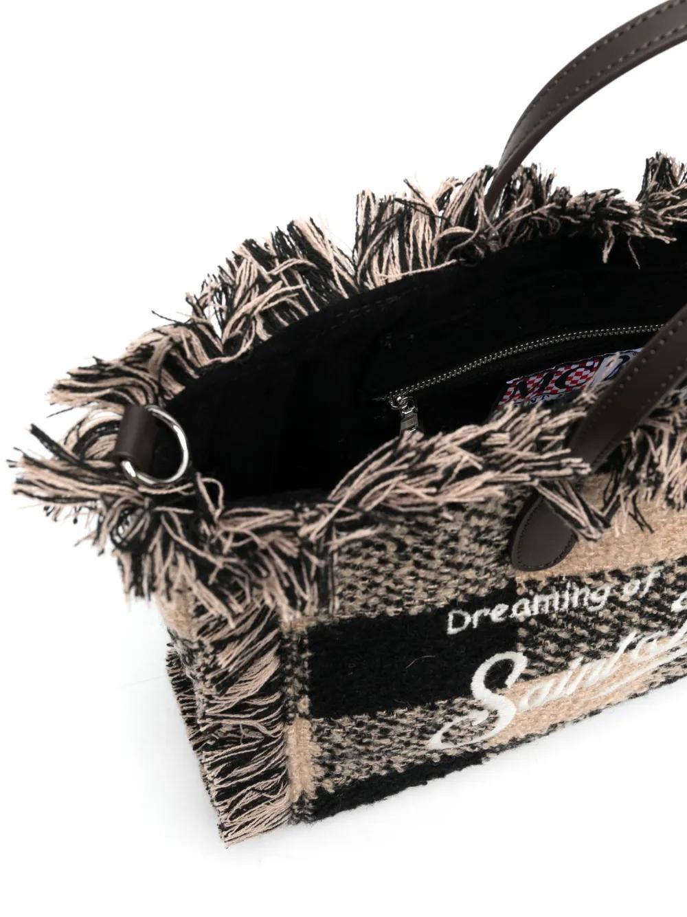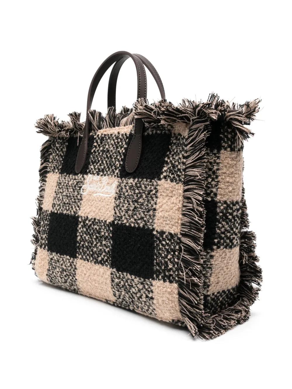 beige/black gingham check pattern fringed edge embroidered logo to the front embroidered logo to the rear two flat top handles detachable shoulder strap internal zip-fastening pocket main compartment