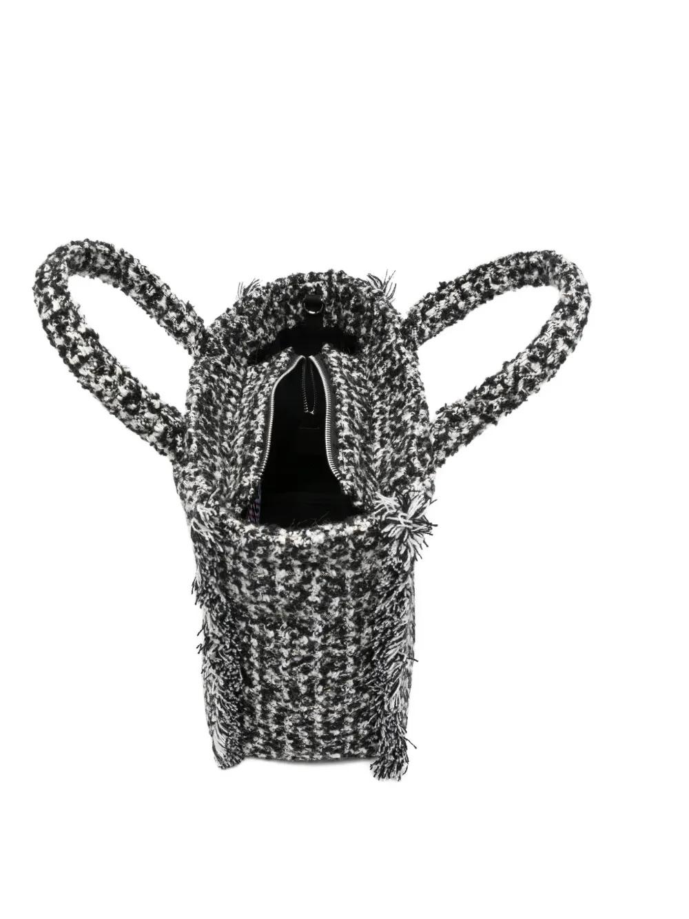 black and white tweed texture fringed trim top handle detachable shoulder strap zip fastening