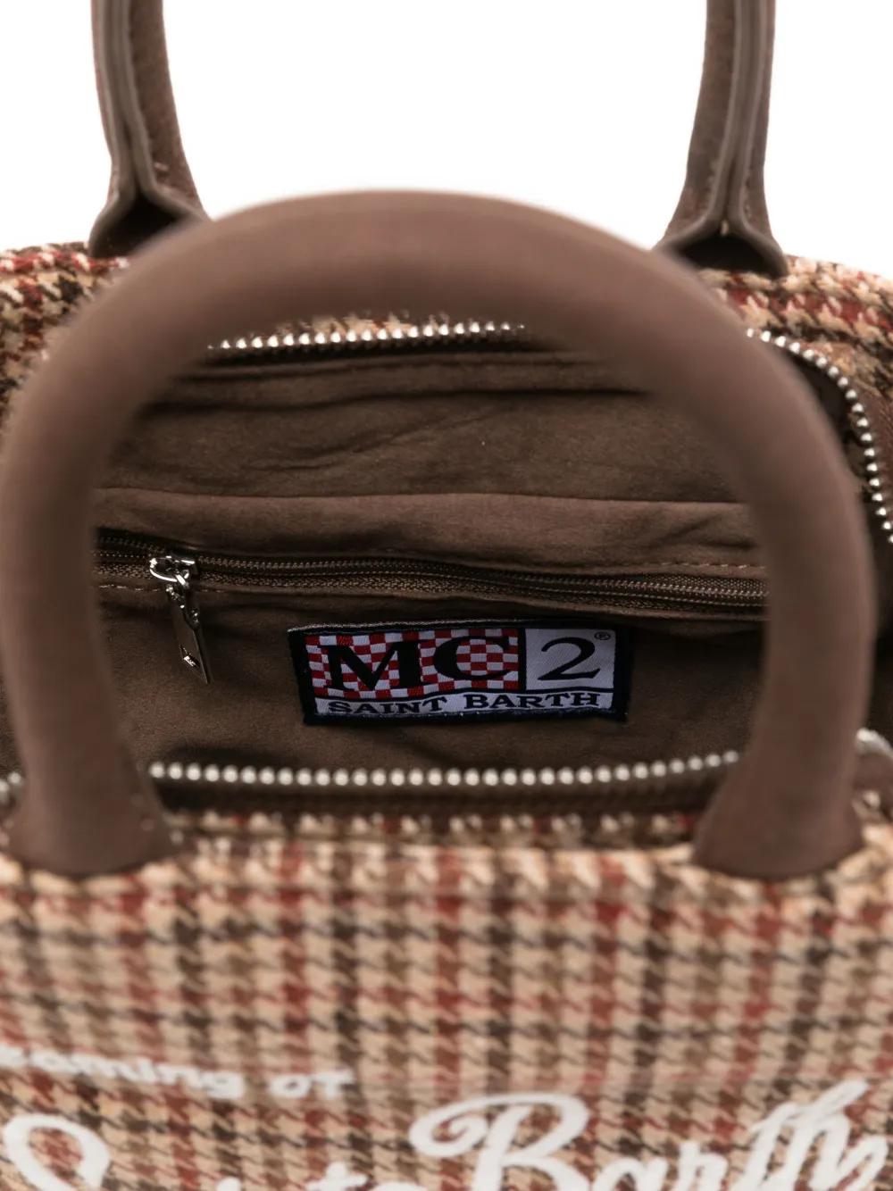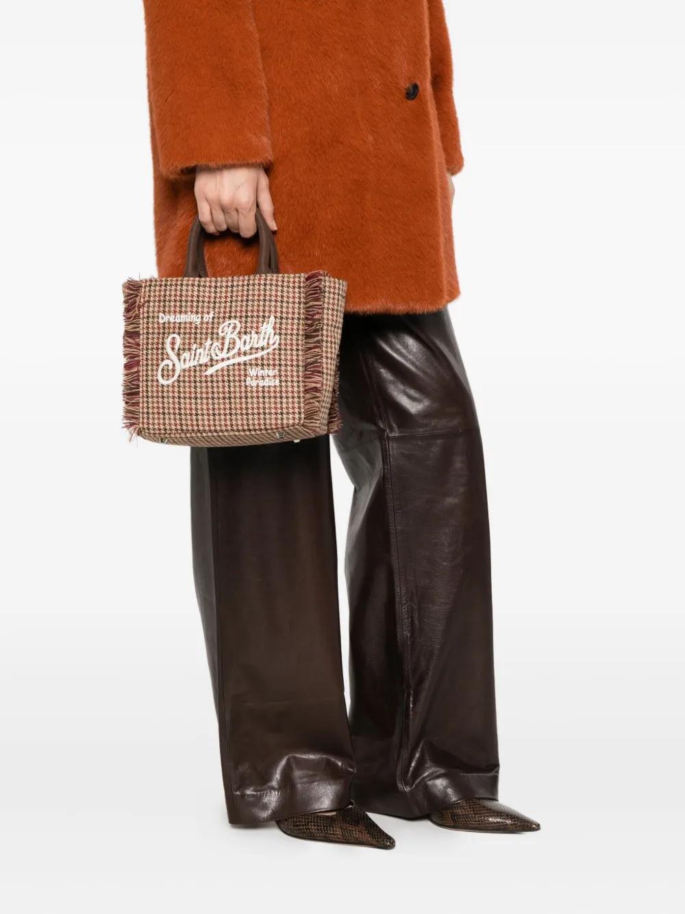 brown houndstooth pattern top handles detachable shoulder strap fringed trim top zip fastening