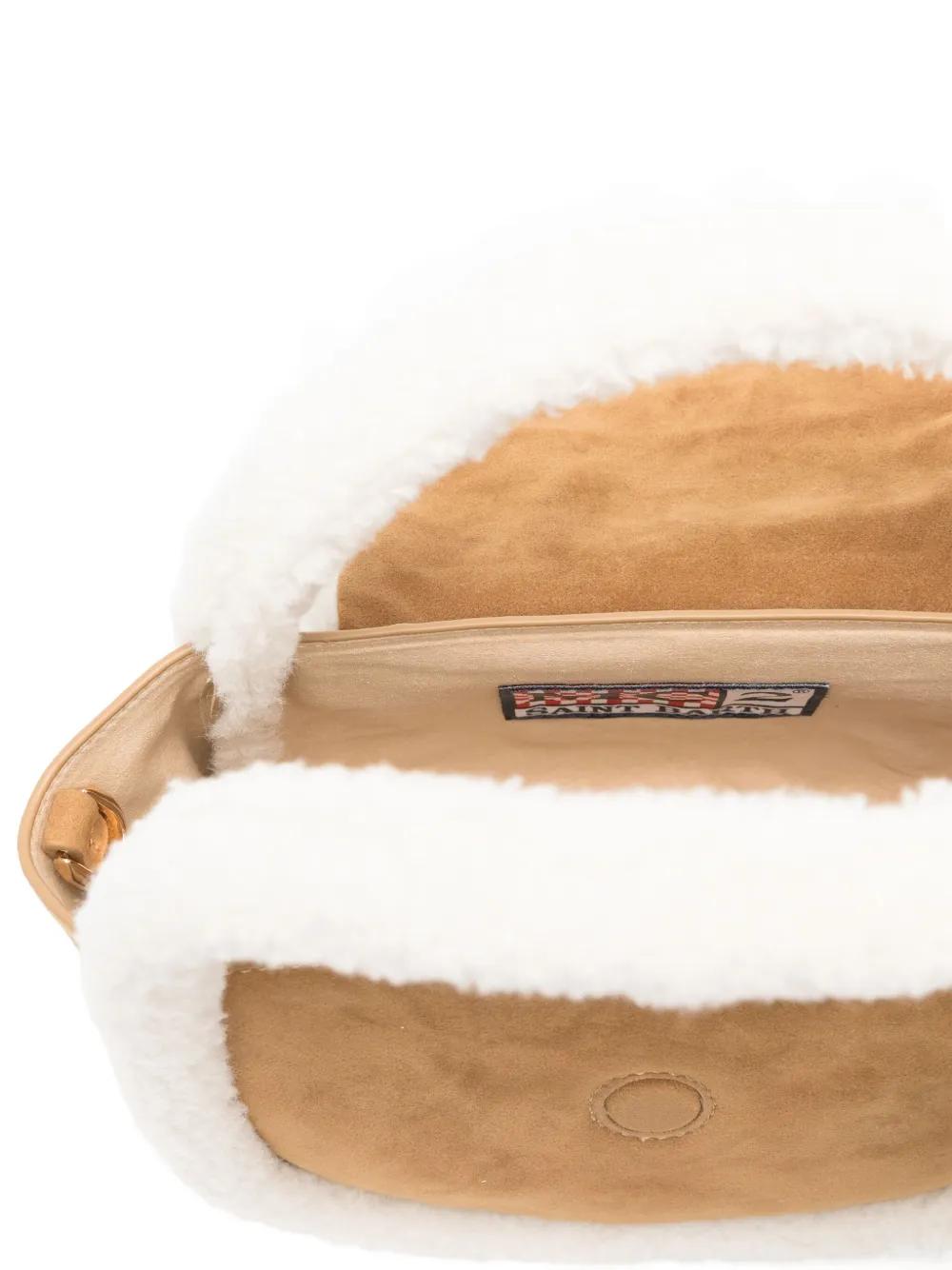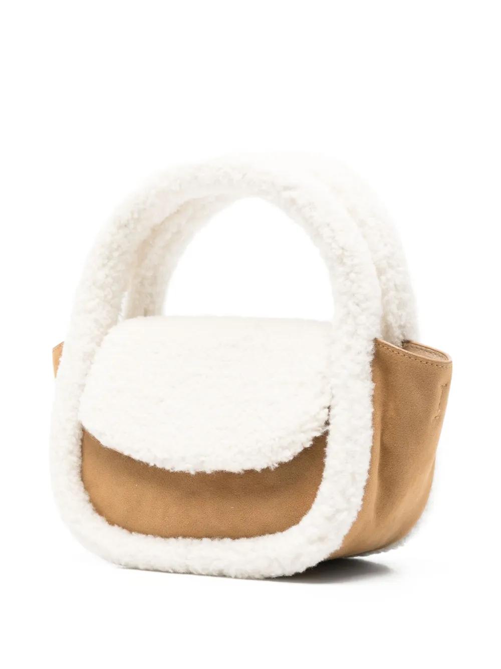 camel brown faux-shearling trim top handles detachable shoulder strap logo lettering