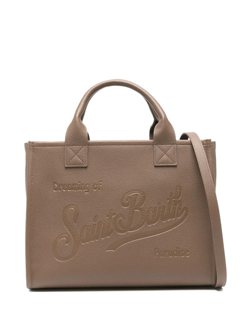 brown leather top handles embossed logo detachable shoulder strap top zip fastening