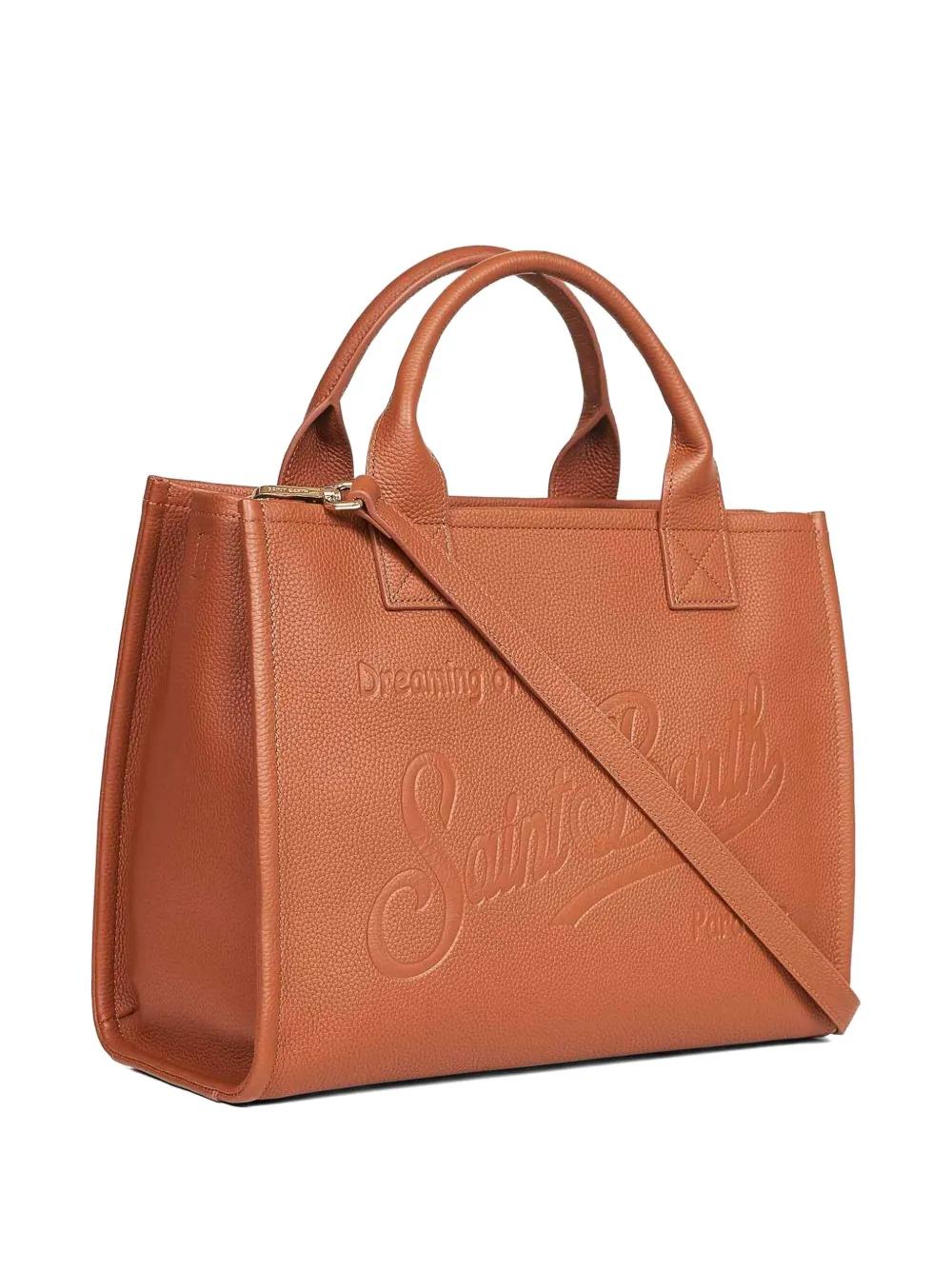 brown leather grained texture debossed logo top handles detachable adjustable shoulder strap gold-tone hardware