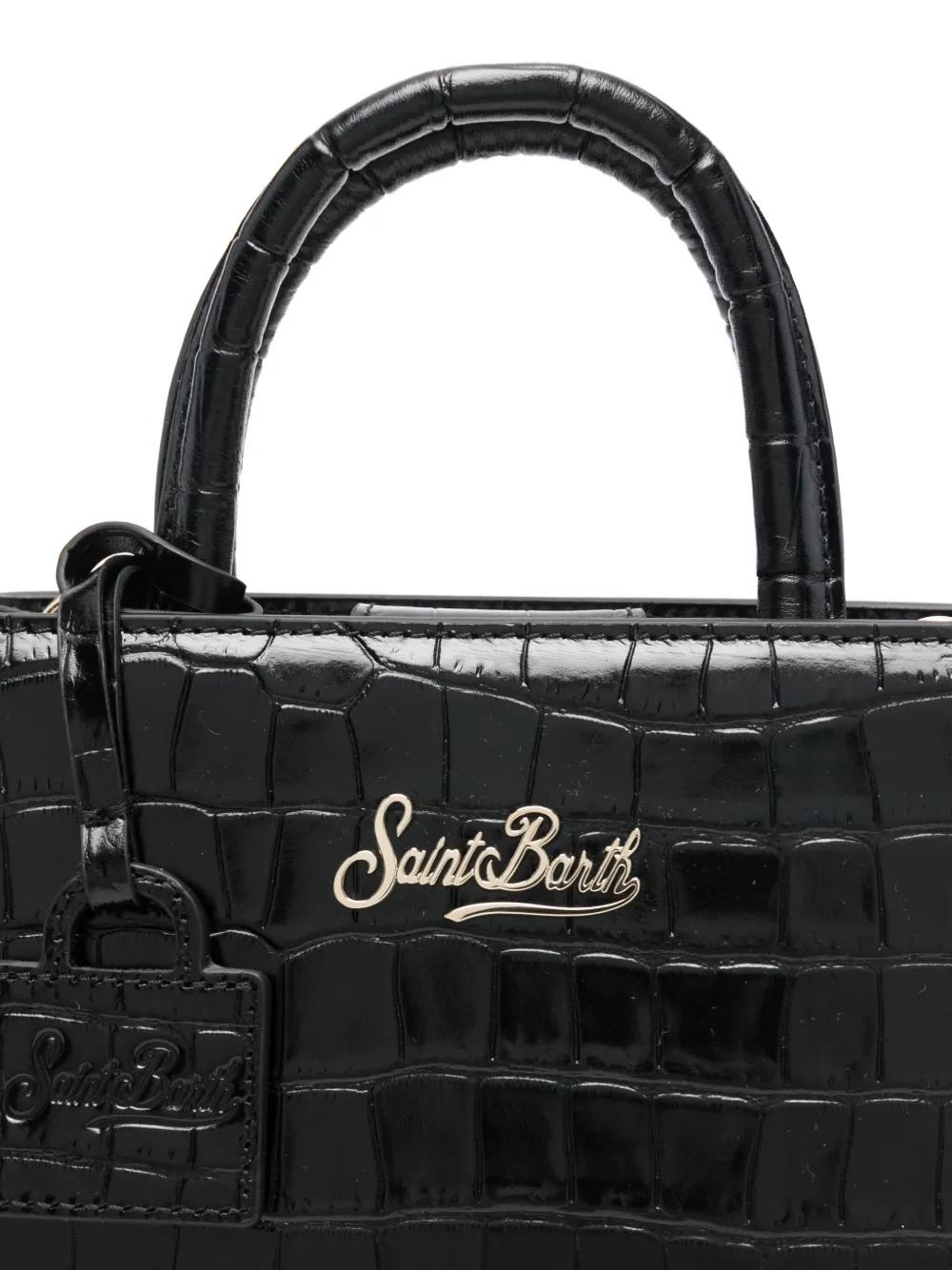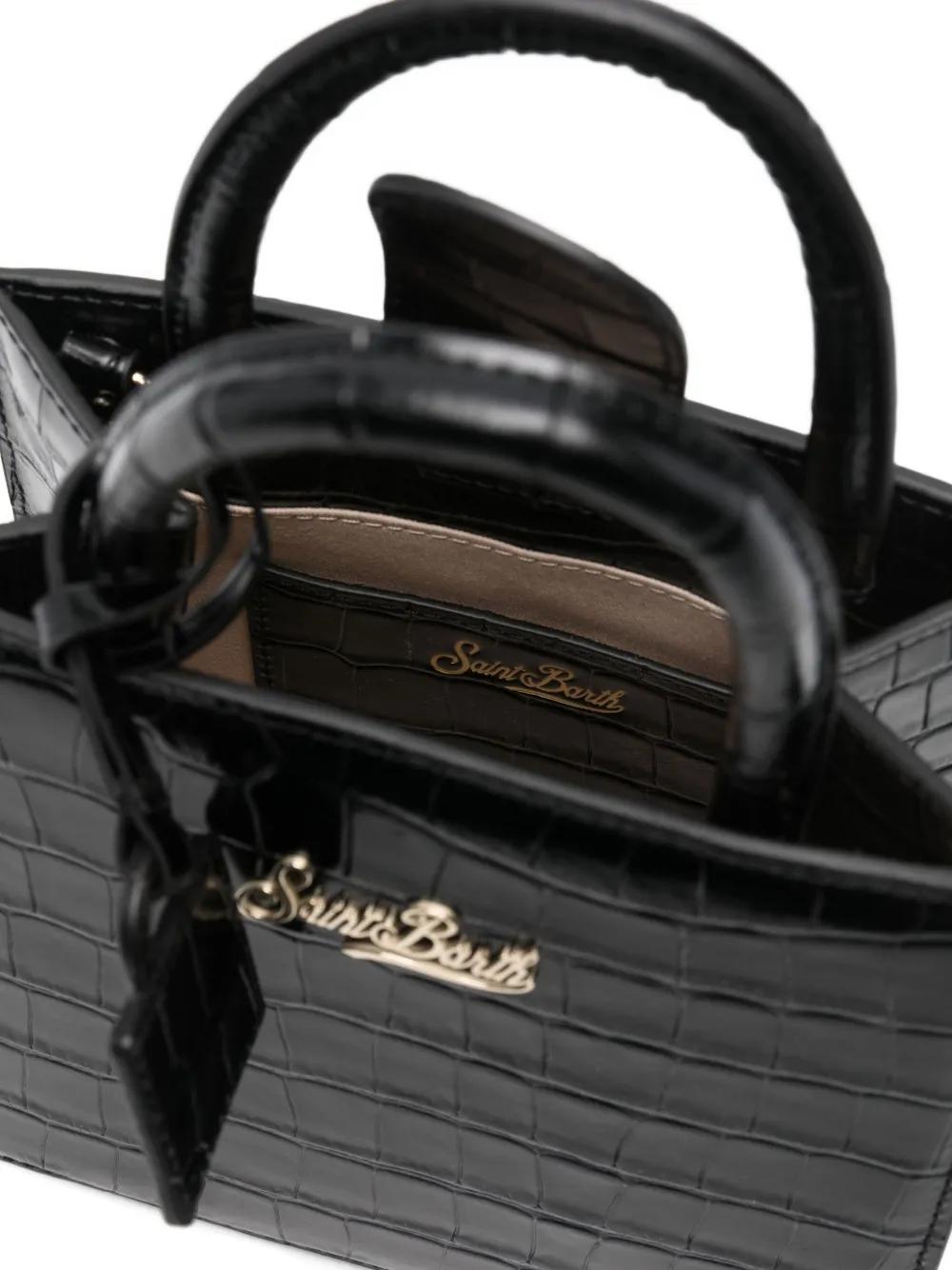 black embossed finish top handle detachable shoulder strap logo lettering tag detail This piece comes complete with a protective dust bag.
