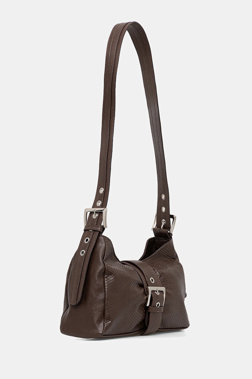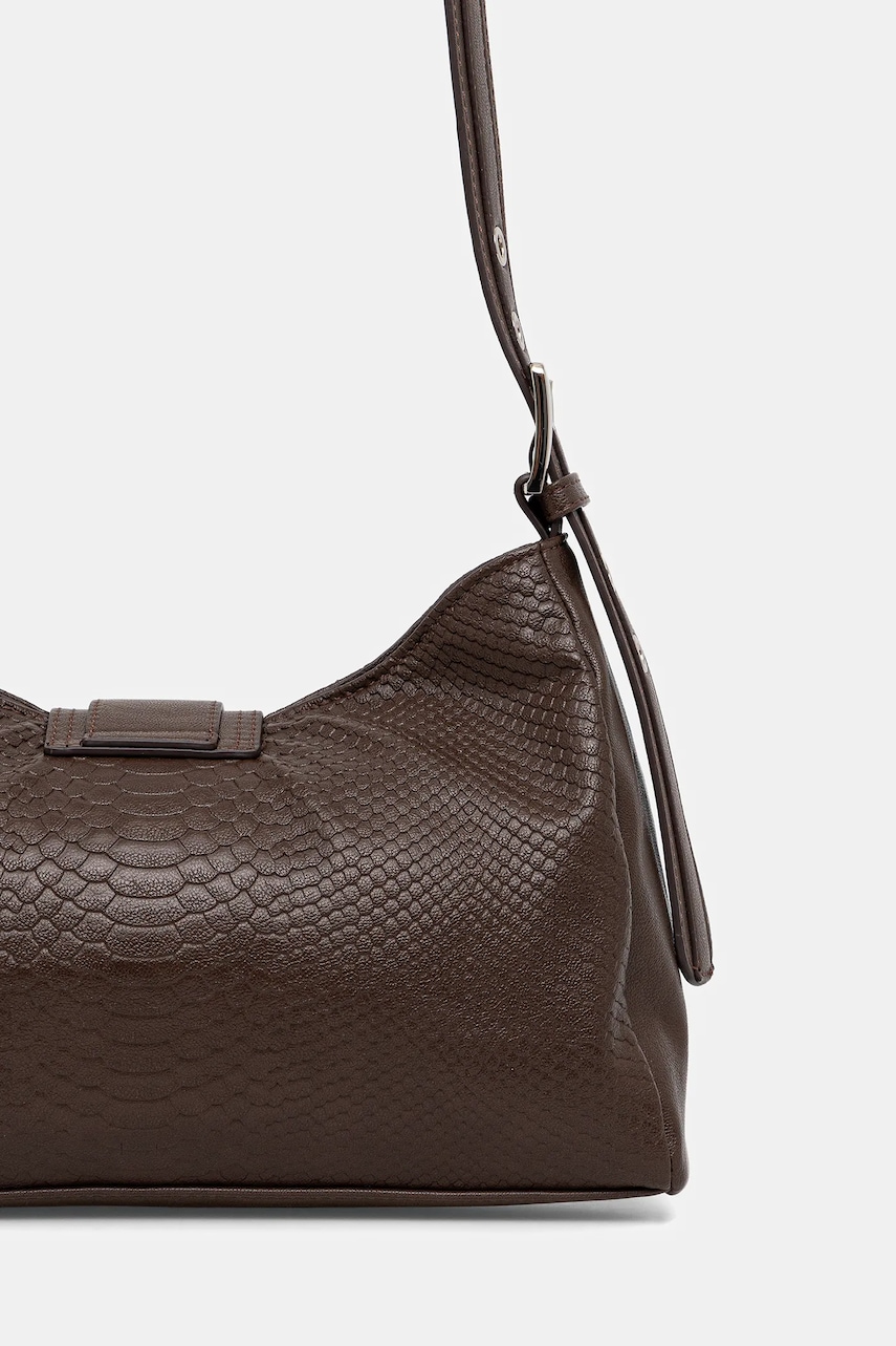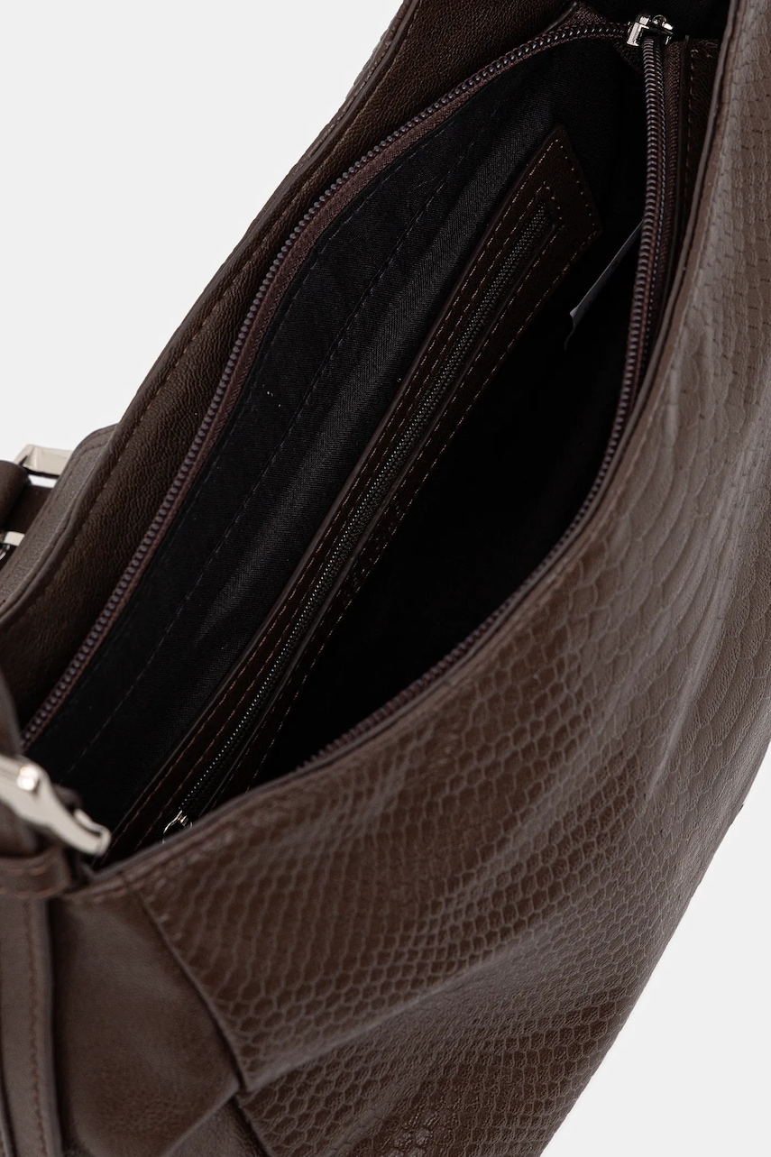 - Model z ozdobną klamrą. - Zapięcie na suwak. - Kieszonka wewnętrzna zapinana na suwak. - Odpinany pasek z regulacją. - Materiał z fakturą wężowej skóry. - Model z podszewką. - Nie mieści formatu A4. - Głębokość: 9 cm. - Wysokość: 20,5 cm. - Szerokość u podstawy: 31 cm.