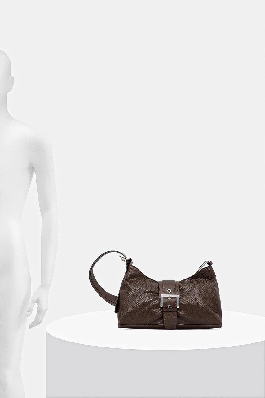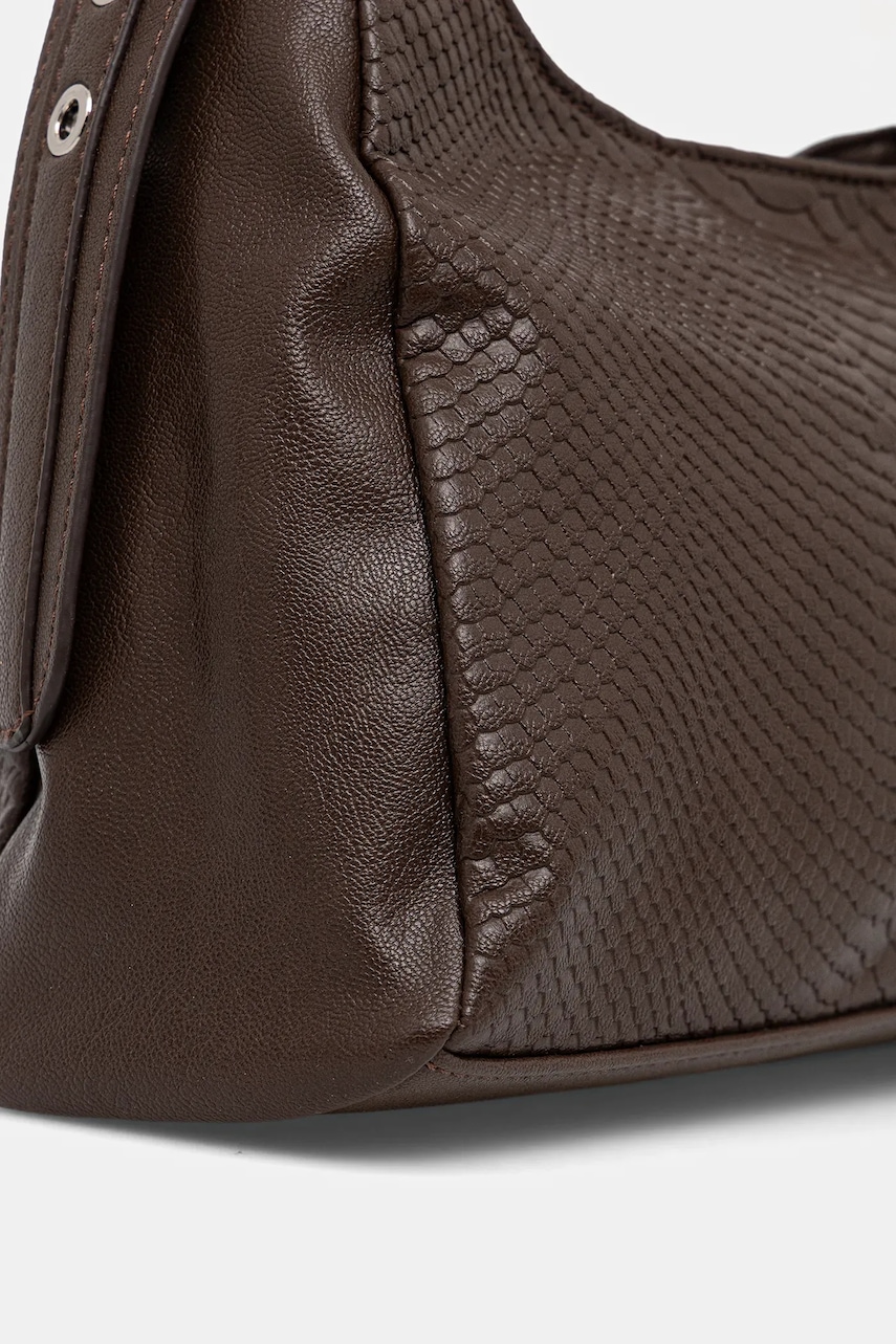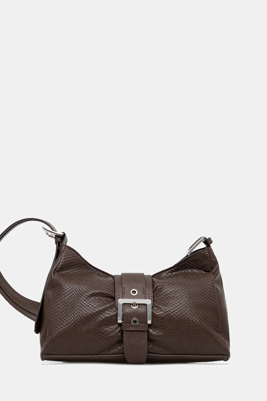 - Model z ozdobną klamrą. - Zapięcie na suwak. - Kieszonka wewnętrzna zapinana na suwak. - Odpinany pasek z regulacją. - Materiał z fakturą wężowej skóry. - Model z podszewką. - Nie mieści formatu A4. - Głębokość: 9 cm. - Wysokość: 20,5 cm. - Szerokość u podstawy: 31 cm.