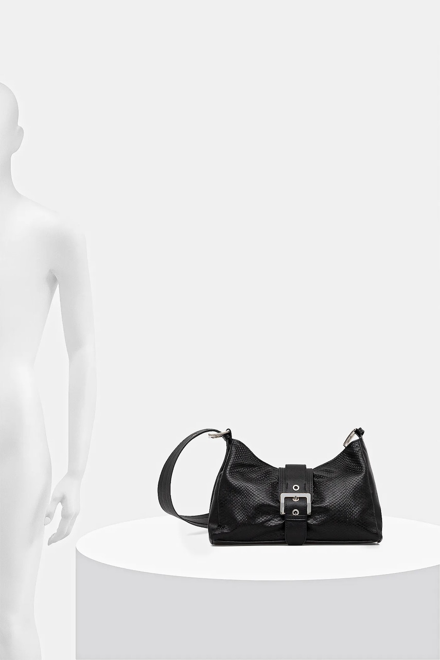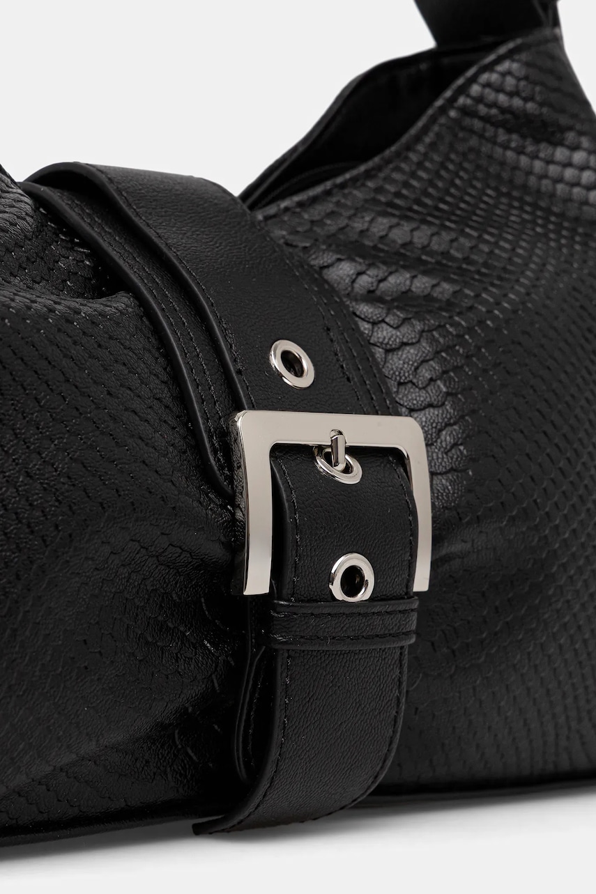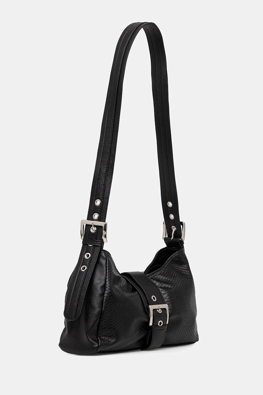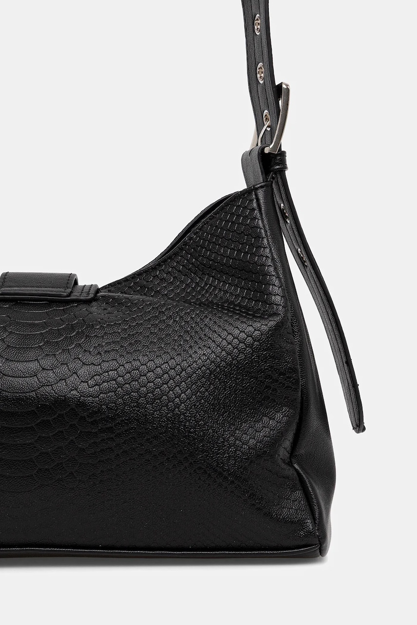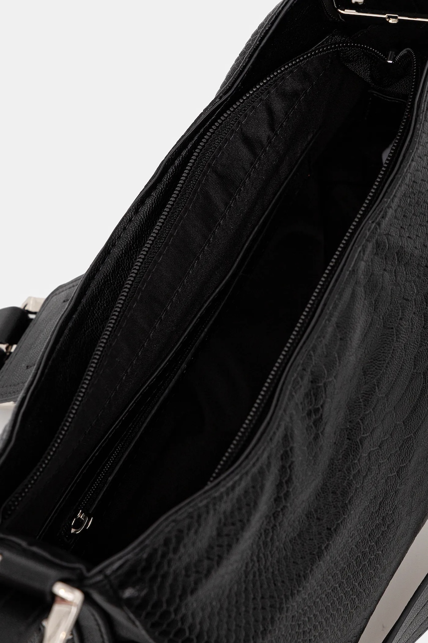 - Model z ozdobną klamrą. - Zapięcie na suwak. - Kieszonka wewnętrzna zapinana na suwak. - Odpinany pasek z regulacją. - Materiał z fakturą wężowej skóry. - Model z podszewką. - Nie mieści formatu A4. - Głębokość: 9 cm. - Wysokość: 20,5 cm. - Szerokość u podstawy: 31 cm.