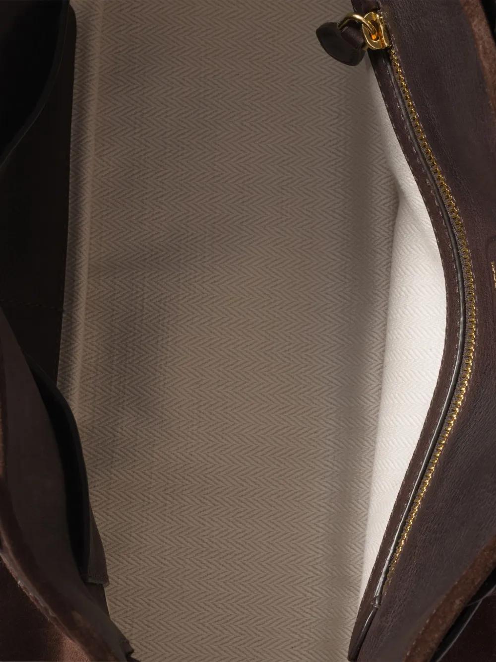 brown suede gold-tone hardware top handles debossed logo buckle fastening