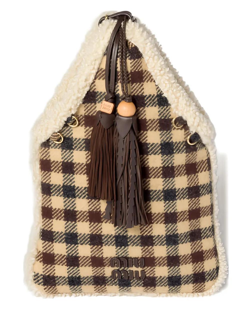 multicolour check pattern tassel detail top handle gold-tone hardware shearling trim