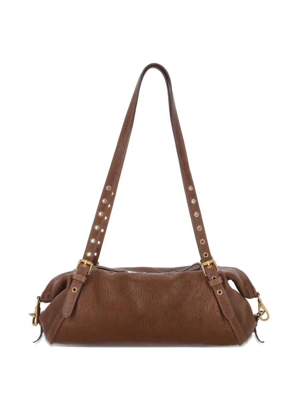 brown lambskin leather embossed logo buckle fastening straps eyeleted shoulder straps cylindrical shape
