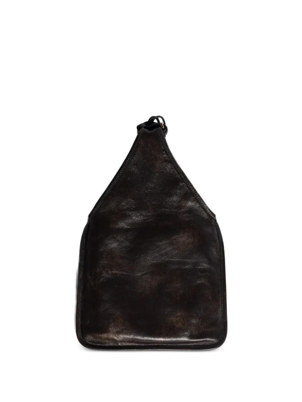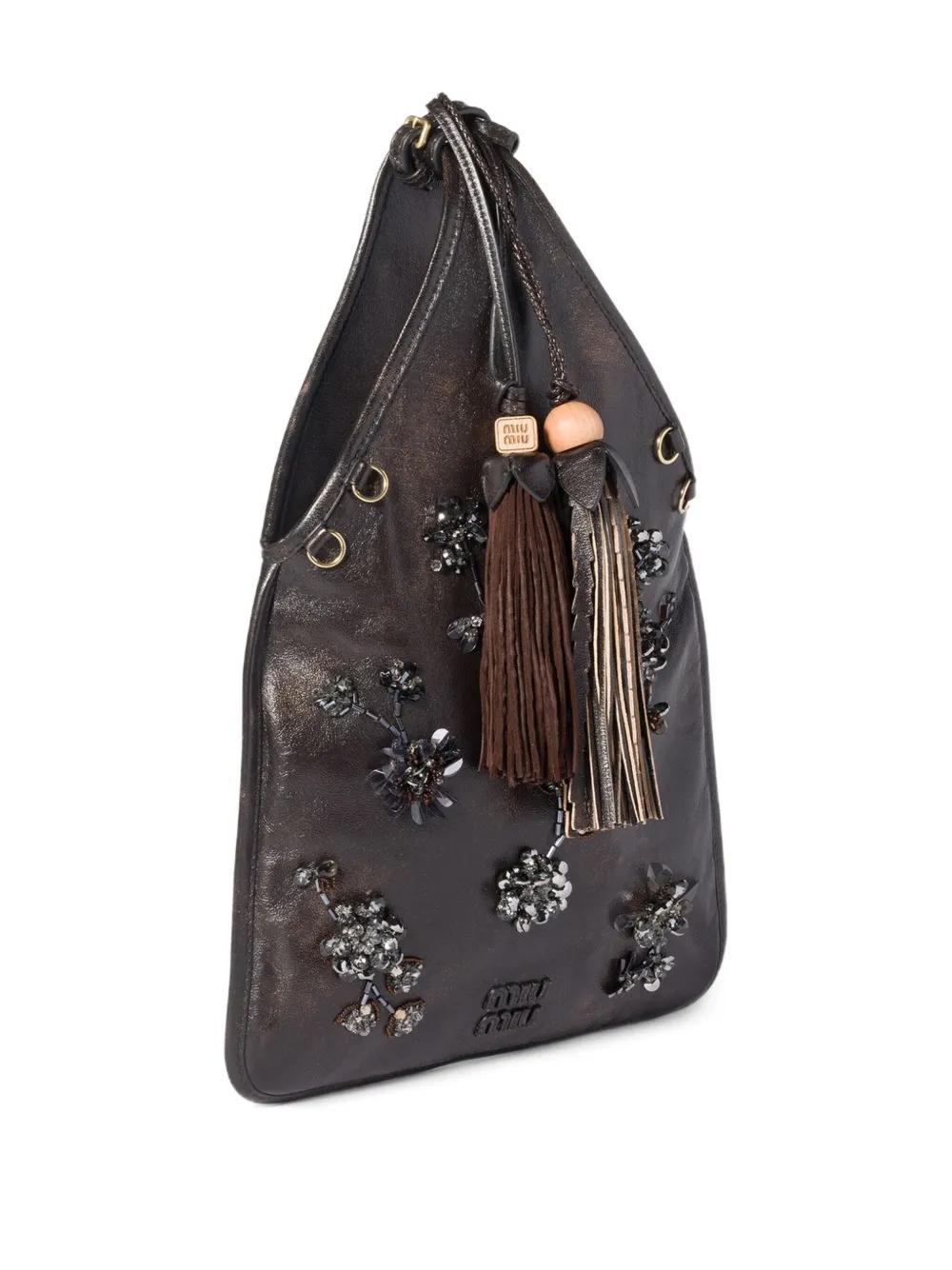 brown gold-tone hardware leather lettering logo patch pocket tassels floral embellishment