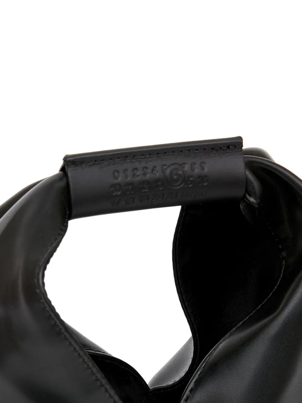 Japanese top-handle tote from MM6 Maison Margiela featuring black, calf leather, internal logo patch, open top and circular top handles.