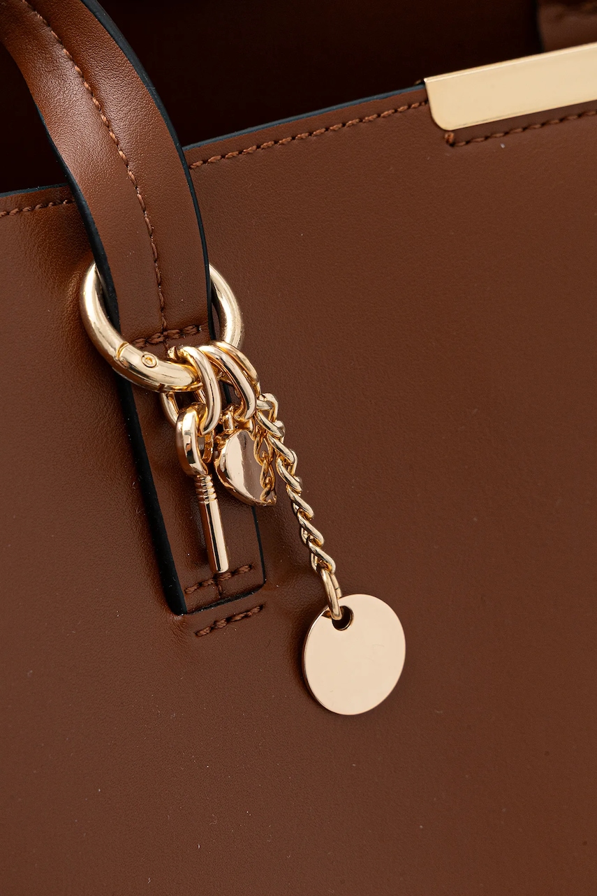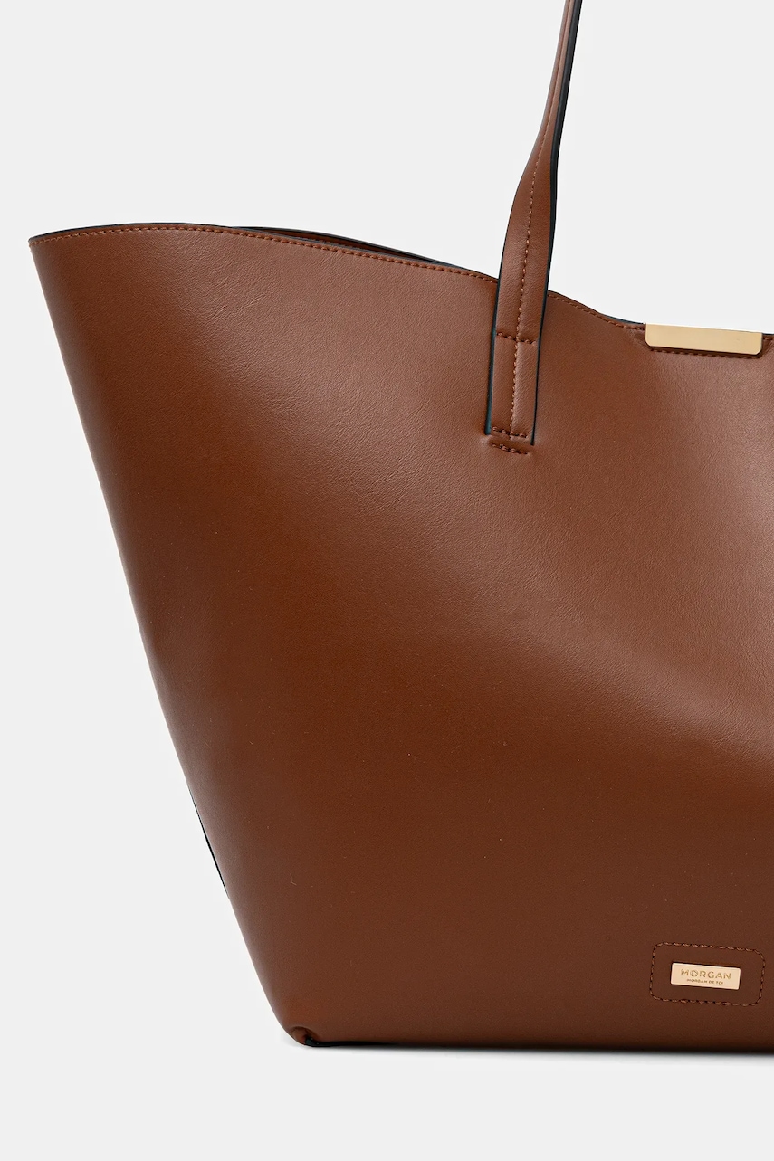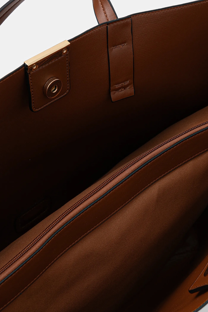 - Zapięcie na magnes. - Kieszonka wewnętrzna zapinana na suwak. - Model bez podszewki. - Krótkie uchwyty dla komfortowego noszenia w dłoni lub na ramieniu. - Mieści format A4. - Długość uchwytów: 61 cm. - Głębokość: 13 cm. - Wysokość: 31 cm. - Szerokość u podstawy: 30 cm.