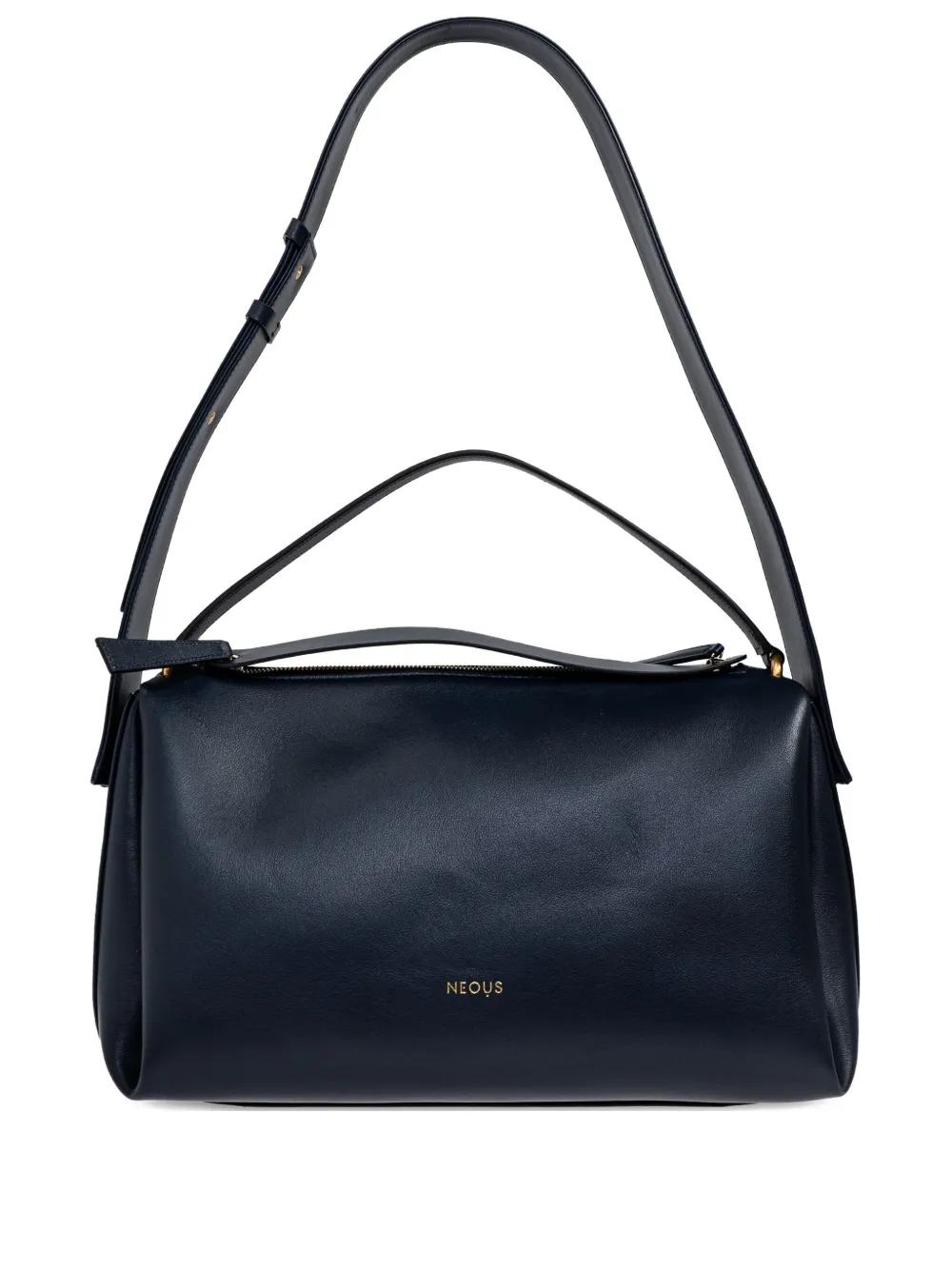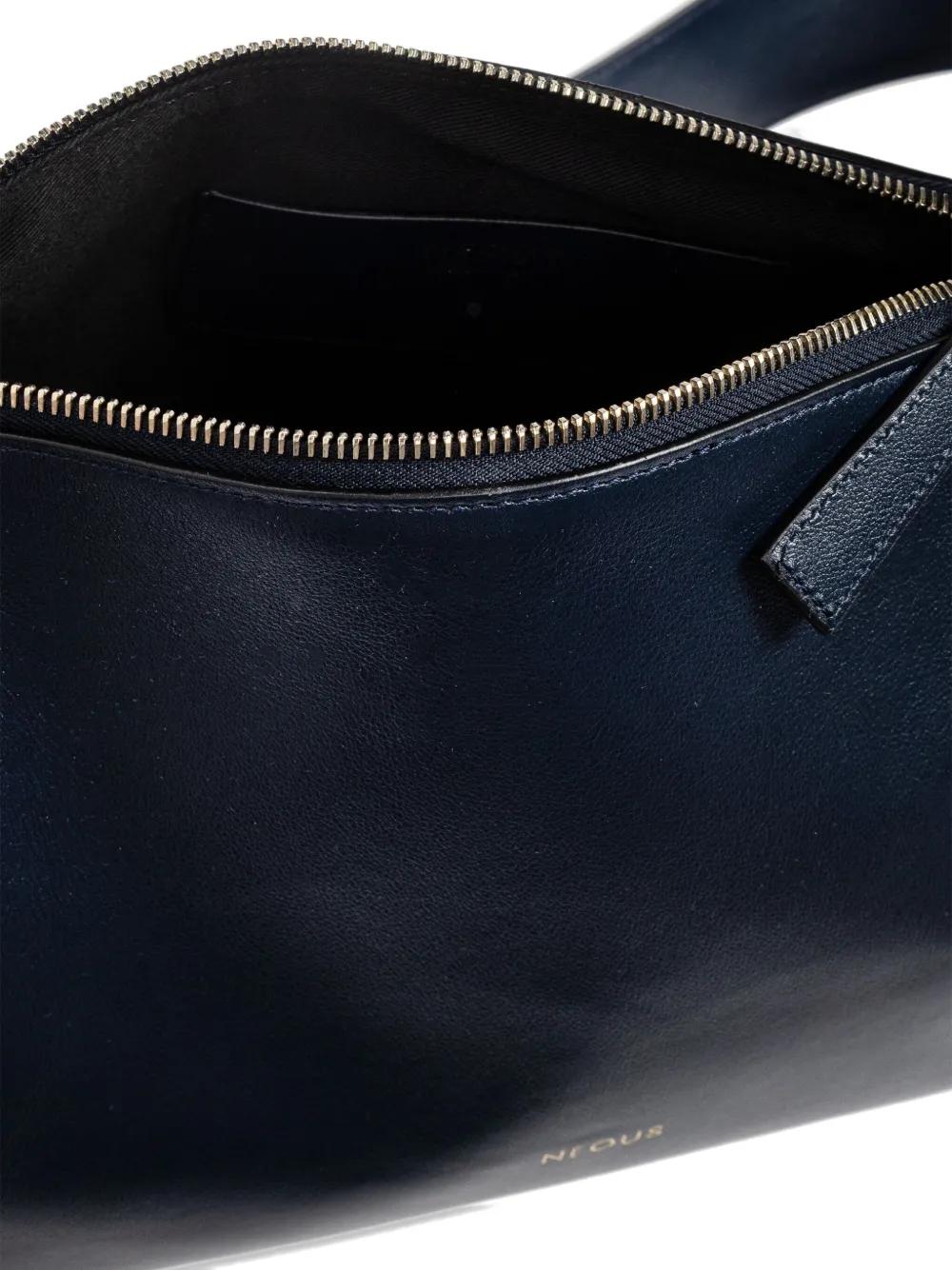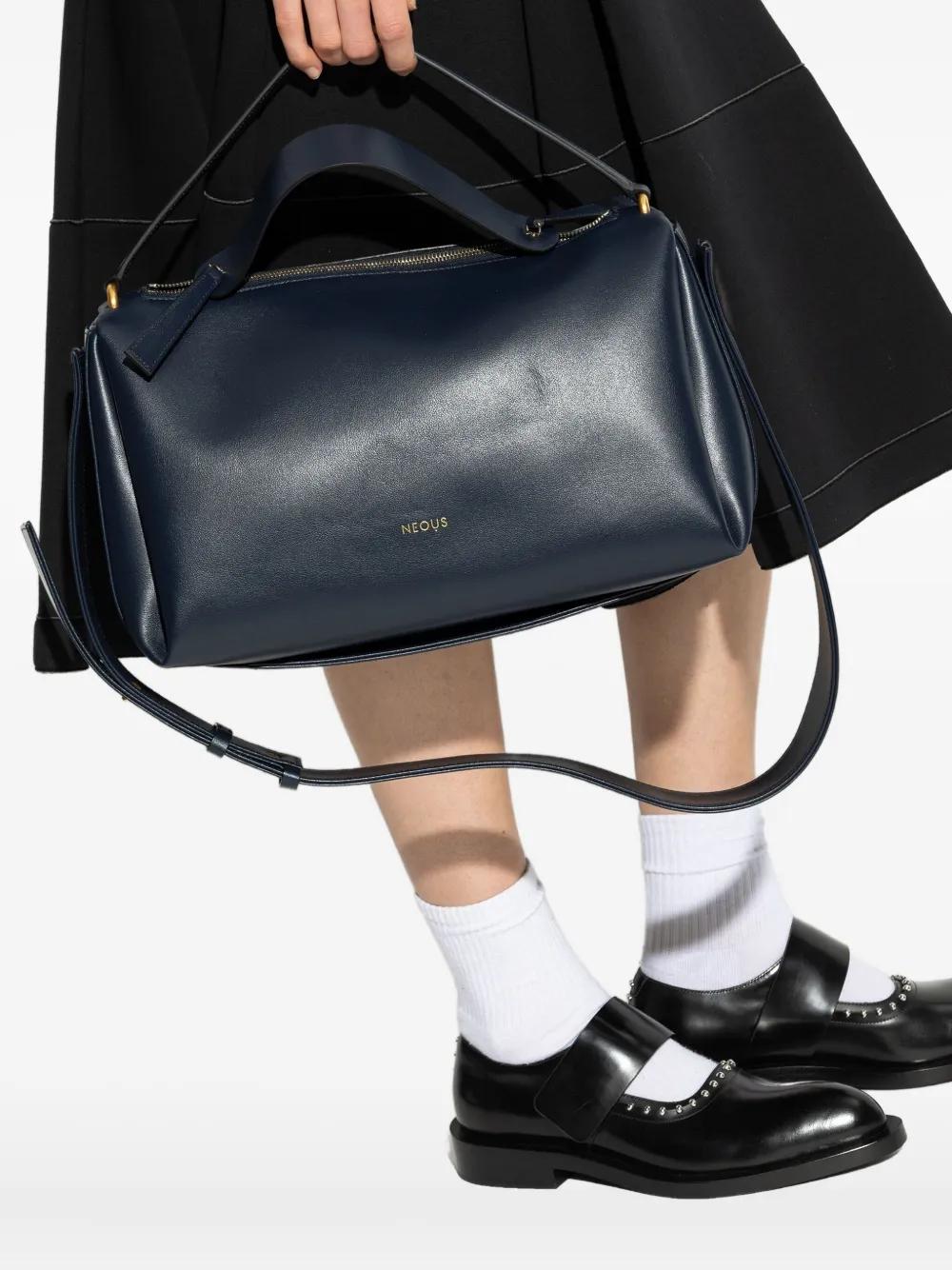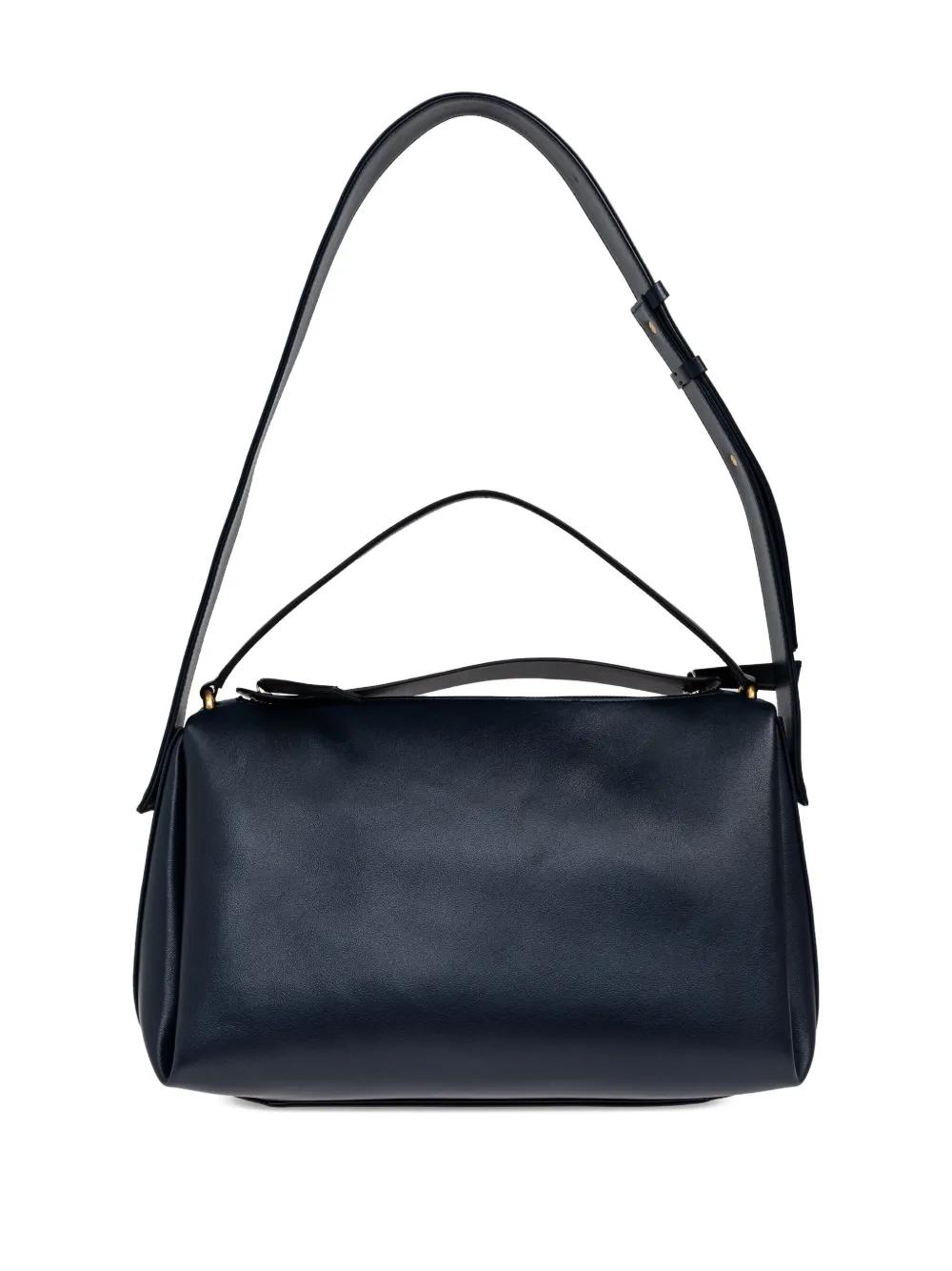 dark blue top handle shoulder strap zip fastening internal slip pocket gold-tone logo lettering