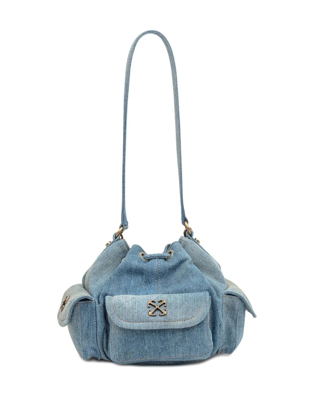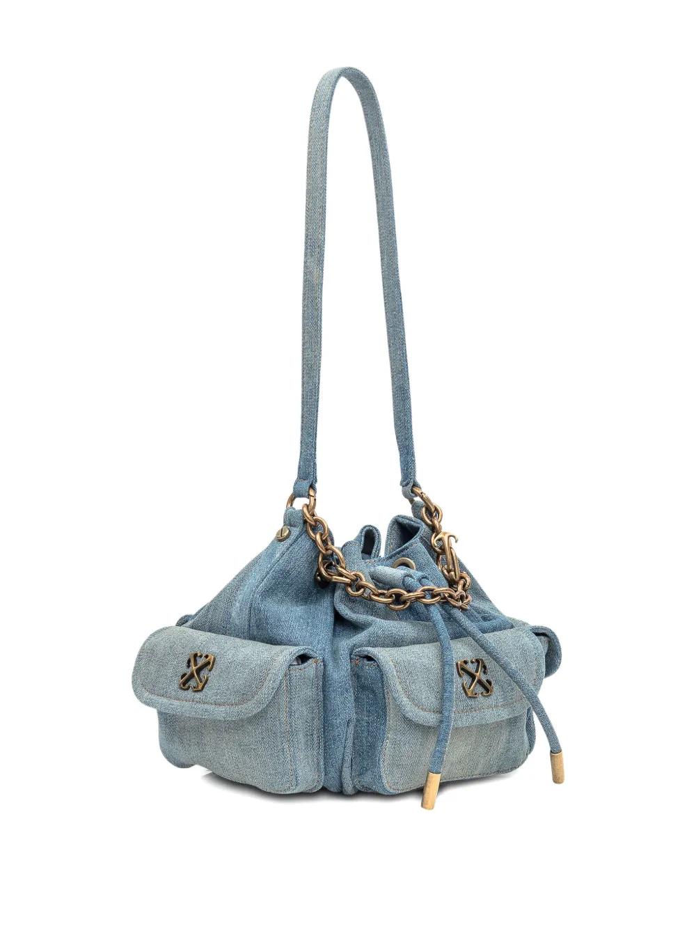 dirty blue gold-tone chain drawstring fastening front pockets metal logo