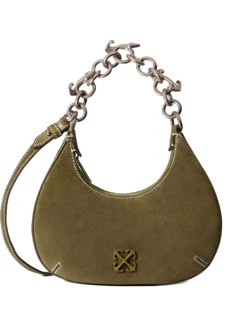 olive green suede chain handle adjustable strap embossed logo motif