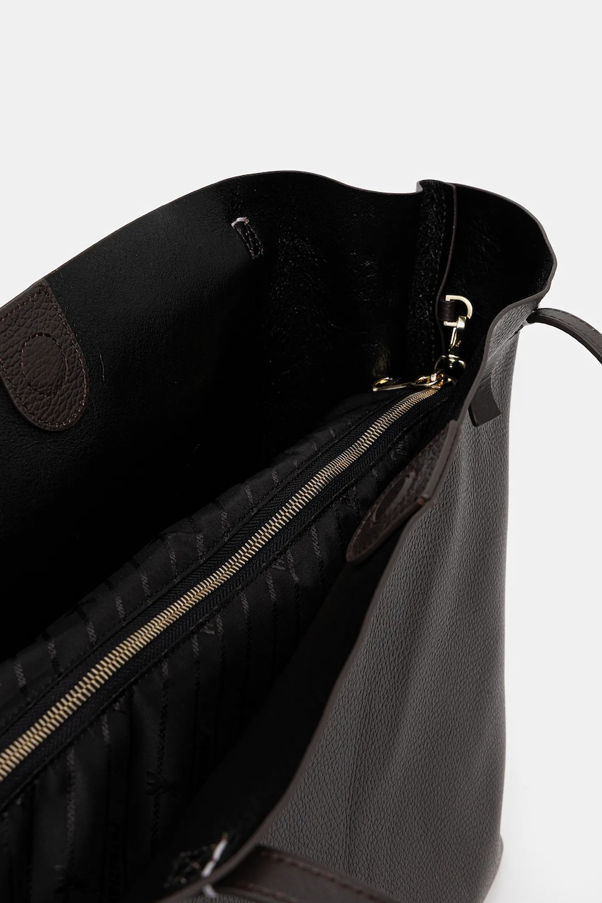- Zapięcie na magnes. - Model bez podszewki. - Brak kieszeni wewnętrznych. - Wypinana komora z podszewką, zapinana na suwak. - Długie uchwyty dla komfortowego noszenia w dłoni lub na ramieniu. - Mieści format A4. - Dołączony tekstylny worek zabezpiecza produkt przed kurzem. - Głębokość: 16 cm. - Wysokość: 31 cm. - Szerokość u podstawy: 31 cm.