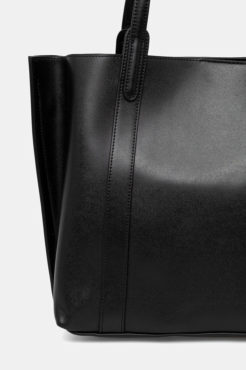 - Komora zapinana na magnes. - Posiada trzy przegrody, w tym jedną zapinaną na suwak. - Usztywnione dno torebki pozwala zachować kształt produktu przez długi czas. - Torebka do noszenia w ręku lub na ramieniu. - Długie uchwyty. - Mieści format A4. - Model bez podszewki. - Liczba niezapinanych przegród: 2. - Liczba przegród zapinanych na suwak: 1. - Długość uchwytów: 72 cm. - Głębokość: 12,5 cm. - Wysokość: 30 cm. - Szerokość u podstawy: 37 cm.