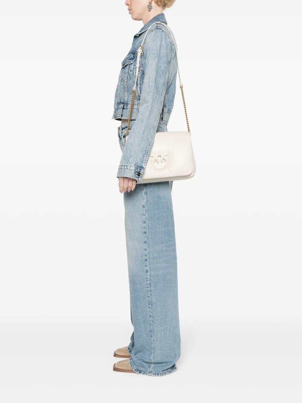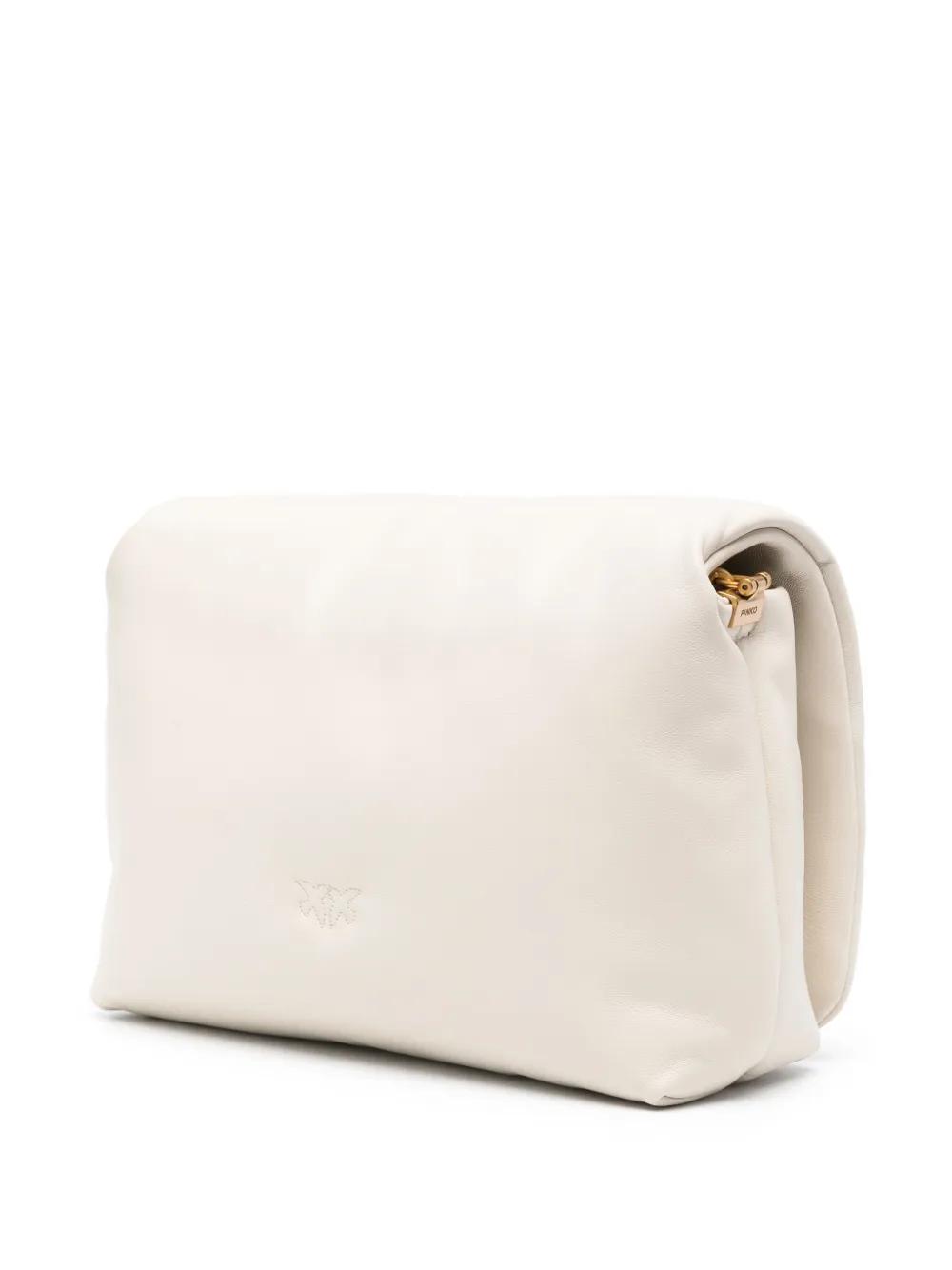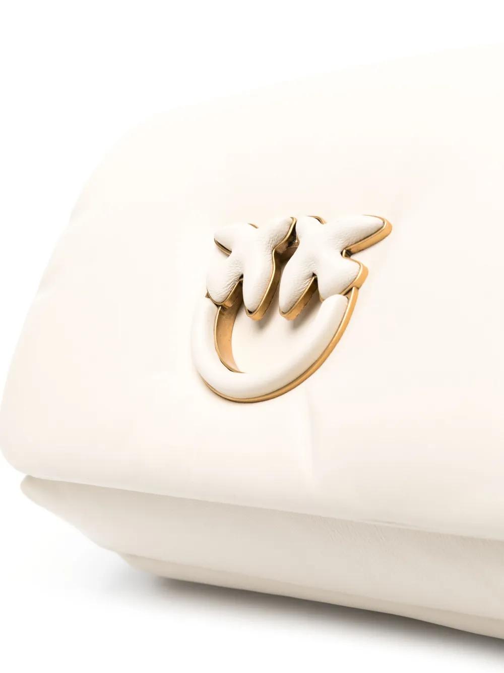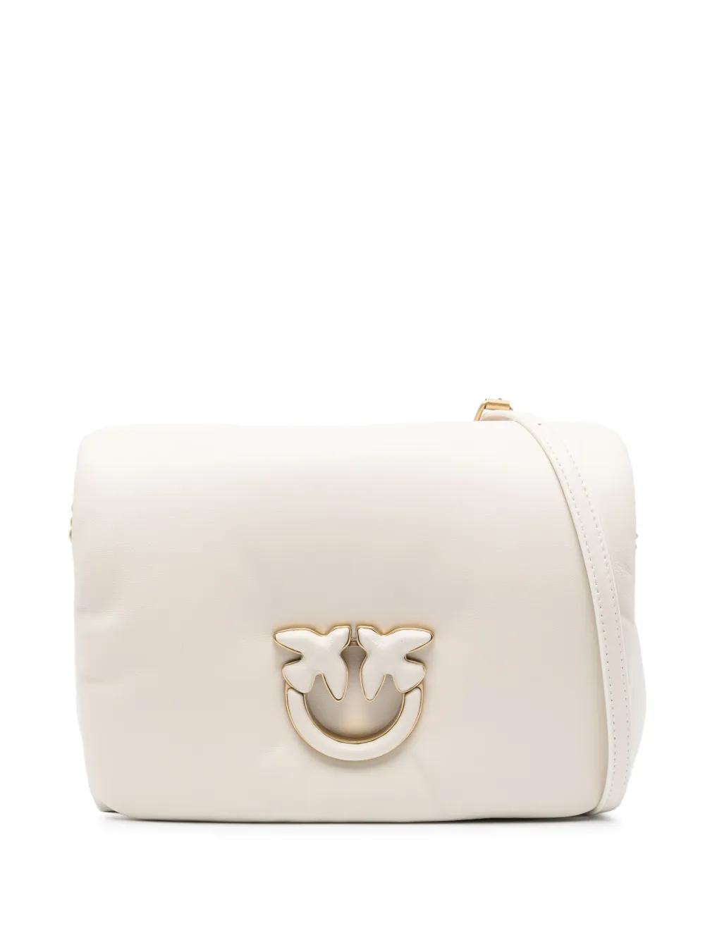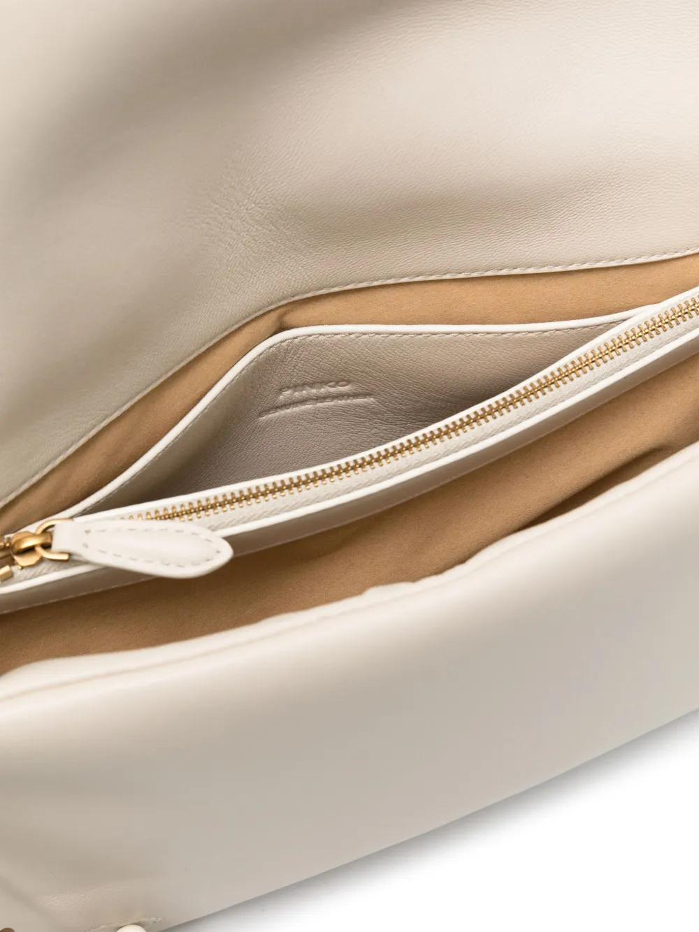 cream white nappa leather padded design adjustable leather and chain-link shoulder strap signature Love Birds plaque partitioned compartment internal zip-fastening pocket debossed internal logo suede lining foldover top with magnetic fastening
