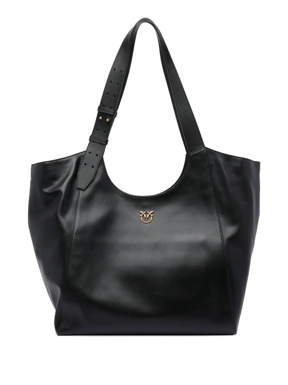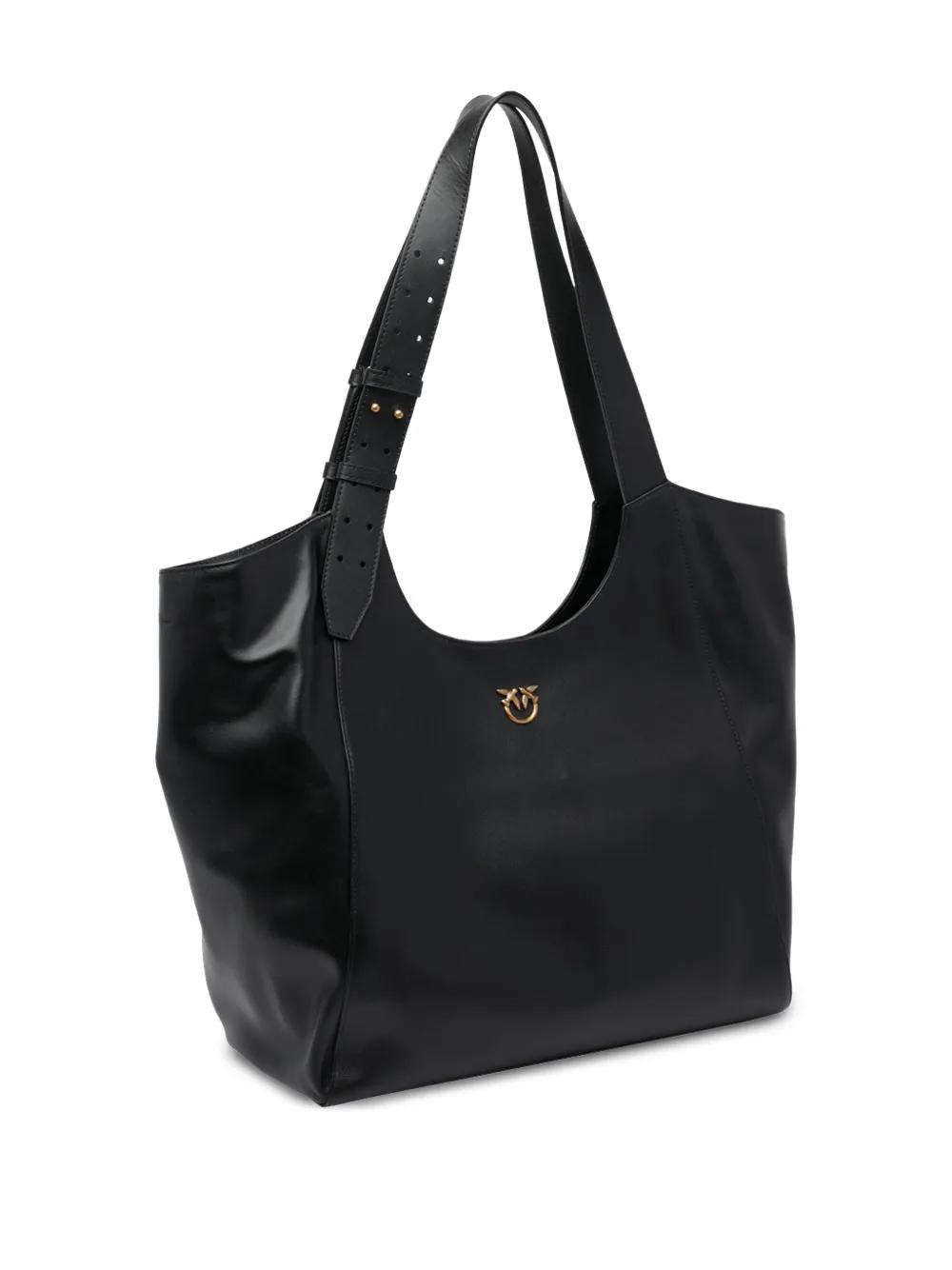 black calf leather logo detail magnetic closure carabiner closure adjustable shoulder strap