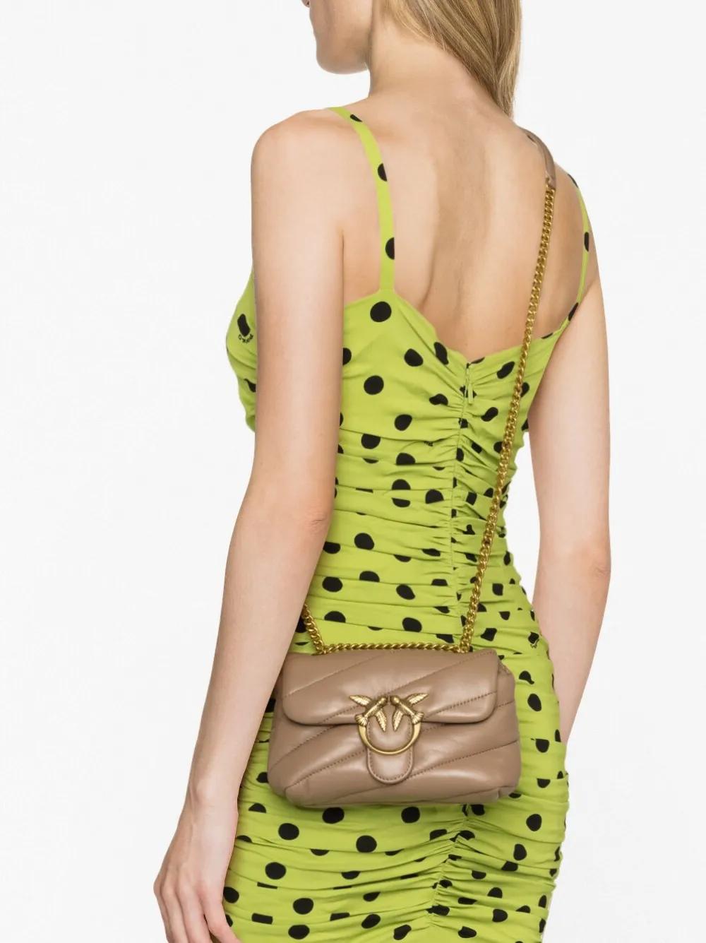 brown calf leather padded design signature Love Birds buckle gold-tone hardware foldover top chain-link shoulder strap internal zip-fastening pocket main compartment