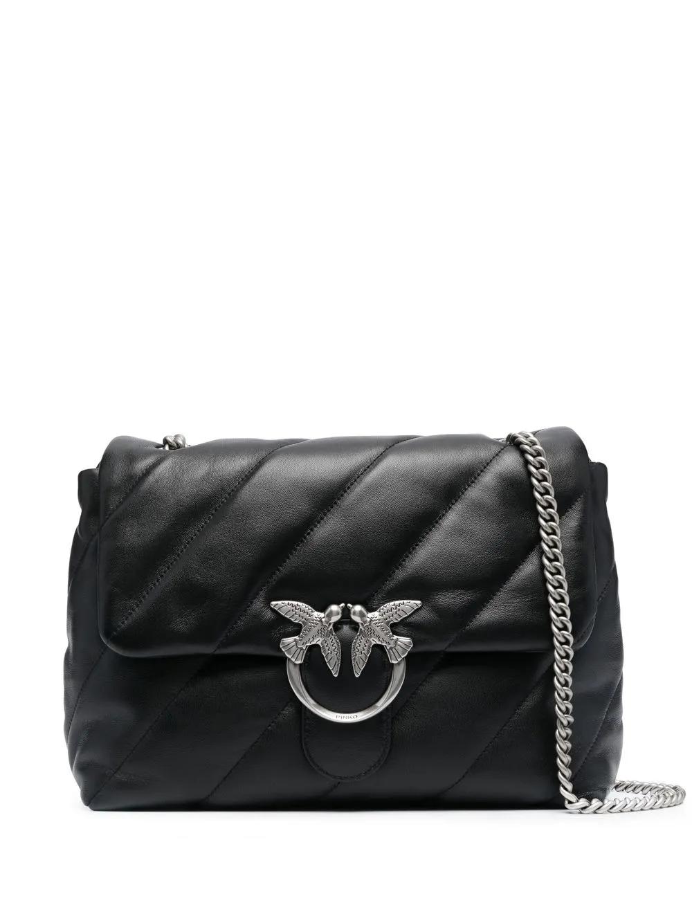 Love Big Puff leather shoulder bag from PINKO featuring jet black, sheepskin, quilted finish, silver-tone hardware, silver-tone logo plaque, chain-link shoulder strap, foldover top with magnetic fastening, main compartment, internal slip pocket and internal zip-fastening pocket.