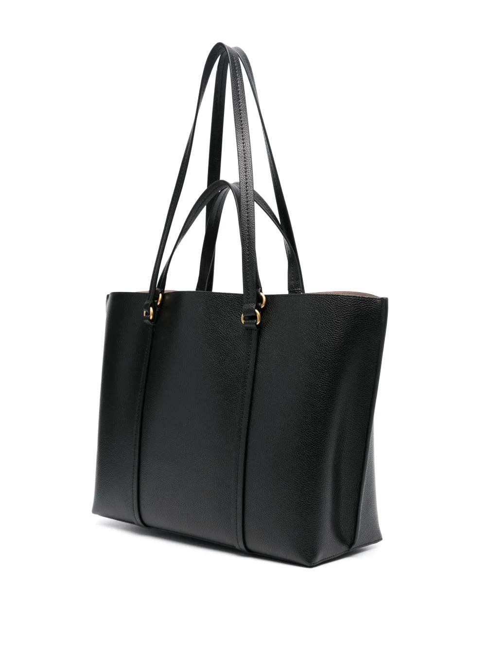 black calf leather grained texture gold-tone hardware detachable signature Love Birds motif debossed internal logo embroidered internal logo open top two flat top handles two flat shoulder straps partitioned compartment internal zip-fastening pocket internal patch pocket leather lining This piece comes complete with a protective dust bag.