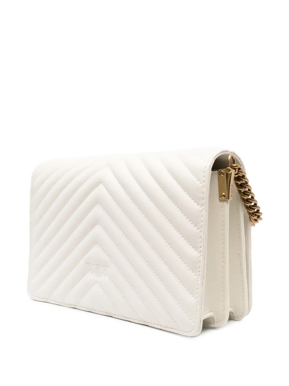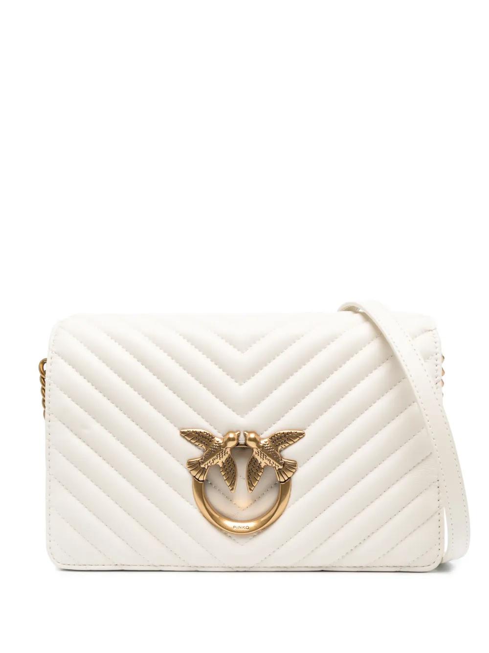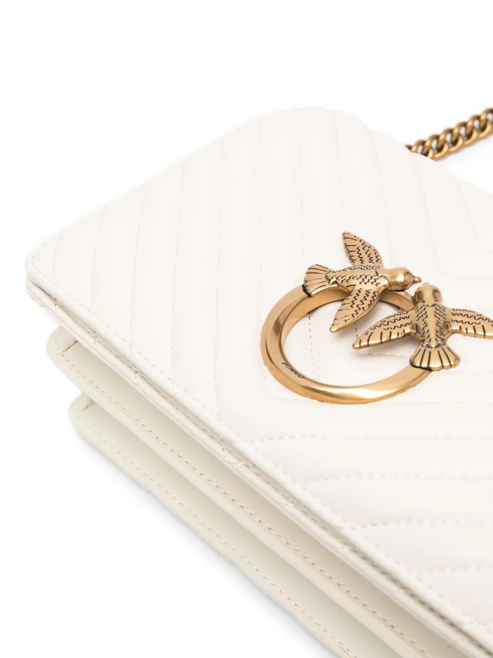 cream white calf leather chevron quilting gold-tone hardware signature Love Birds buckle foldover top adjustable leather and chain-link shoulder strap partitioned compartment internal zip-fastening pocket