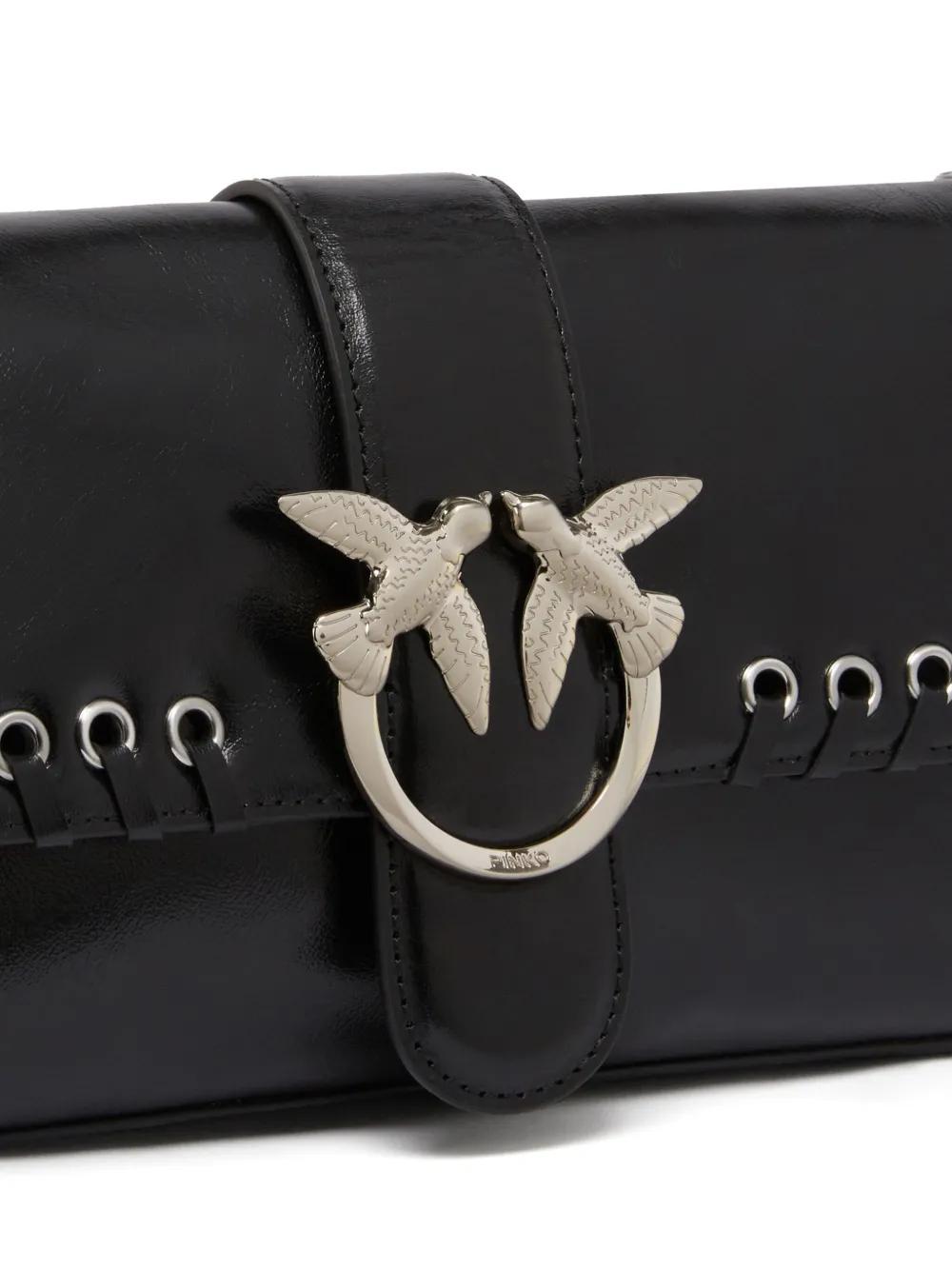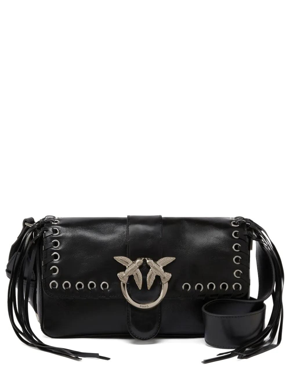 black single shoulder strap foldover top with magnetic fastening signature Love Birds buckle fringe detailing