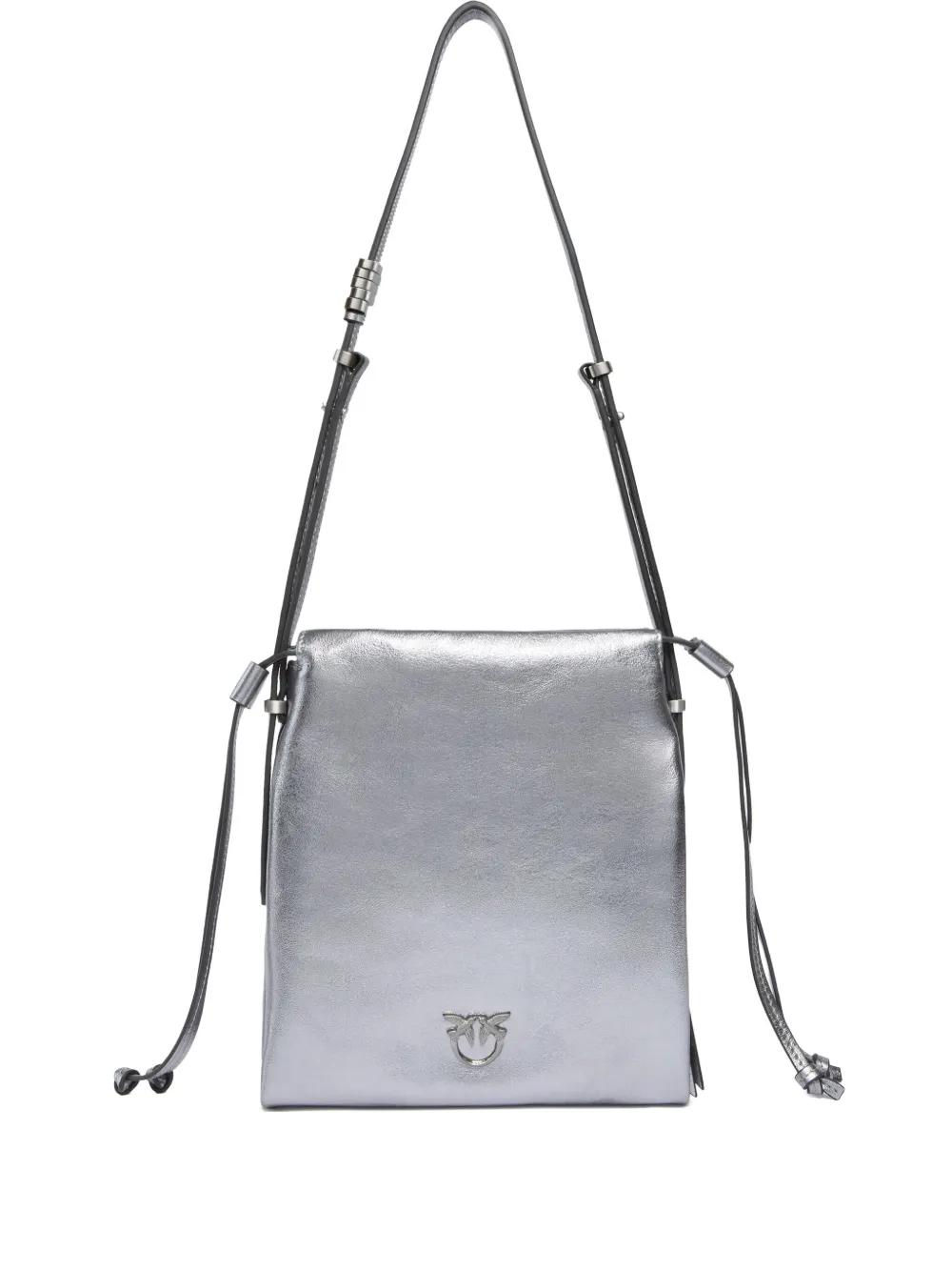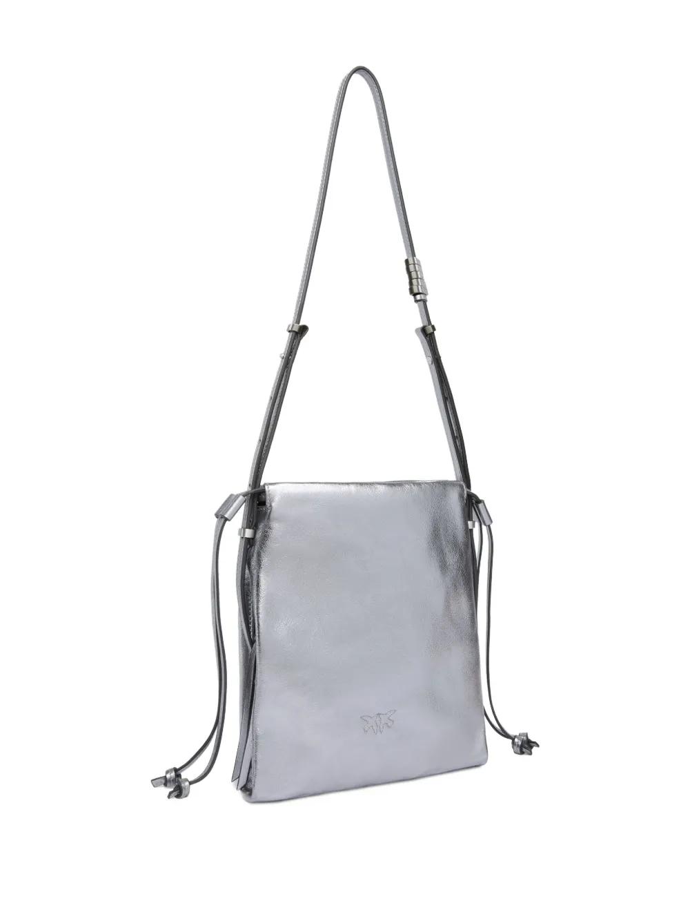 gunmetal grey metallic leather drawstring fastening adjustable shoulder strap Love Birds logo