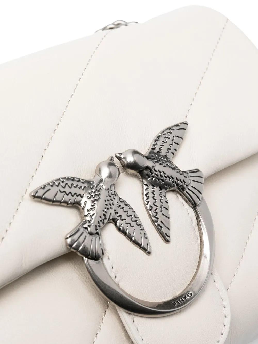 white sheepskin quilted finish signature Love Birds buckle silver-tone hardware foldover top with magnetic fastening chain-link shoulder strap