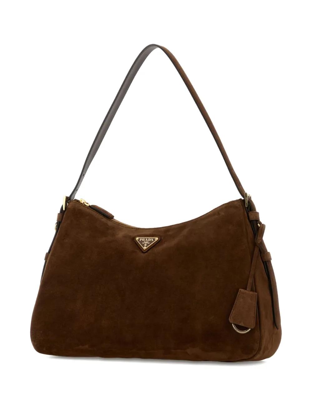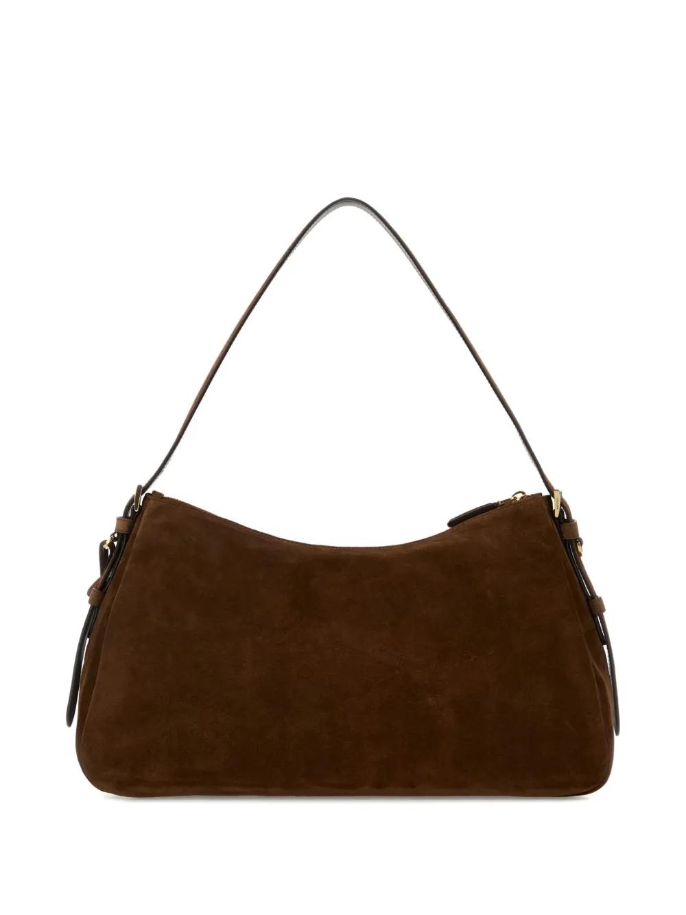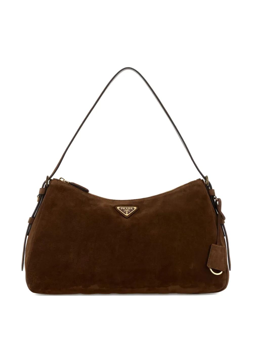 brown suede top zip fastening top handle gold-tone hardware logo plaque detachable charm